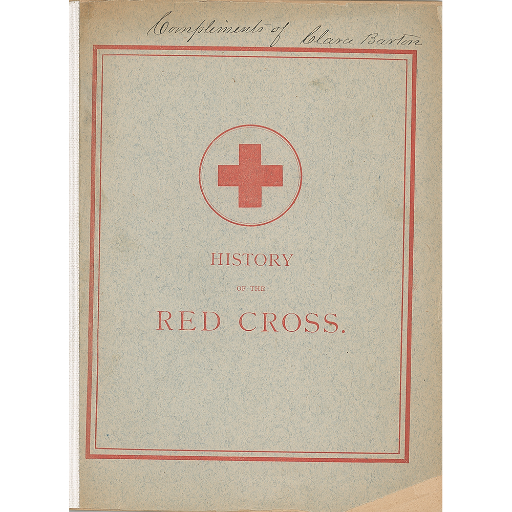 Signed book: History of the Red Cross. Washington: Government Printing Office, 1883. Paperback, 6.5 x 8.75, 227 pages. Signed on the front cover in black ink, "Compliments of Clara Barton." Housed in a custom clamshell case. In very good to fine condition, with edge toning, a block of toning to the title page, and a missing lower right corner tip.