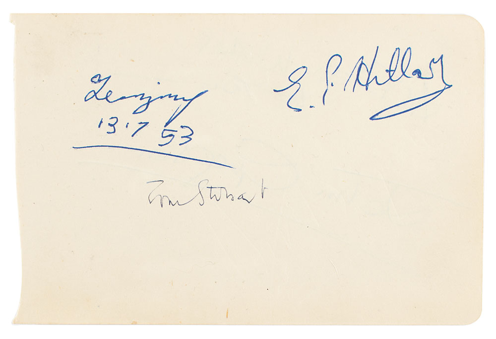 Vintage ink signatures, "E. P. Hillary" and "Tenzing, 13. 7. 53,” on an off-white 6.25 x 4 album page, which is also signed by Tom Stobart, a British cameraman, filmmaker, and author, notable for having shot The Conquest of Everest, the official film of the 1953 British Mount Everest Expedition. In fine condition.