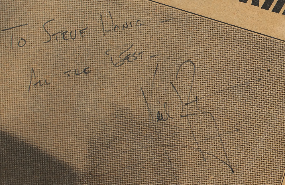 Original issue of the New York Daily News from "Moonday, July 21, 1969," Long Island Final edition, Vol. 51, No. 22, 64 pages, 10.5 x 15.25, signed and inscribed on the front cover in black ink, "To Steve Honig—All the best—Neil Armstrong." Above the rare image—one showing Armstrong walking on the moon—is a subhead featuring Armstrong's iconic words: "One Small Step for Man? One Giant Leap for Mankind." In very good to fine condition, with wear and small tears along the spine, and expected fragility from age. Accompanied by a full letter of authenticity from JSA.