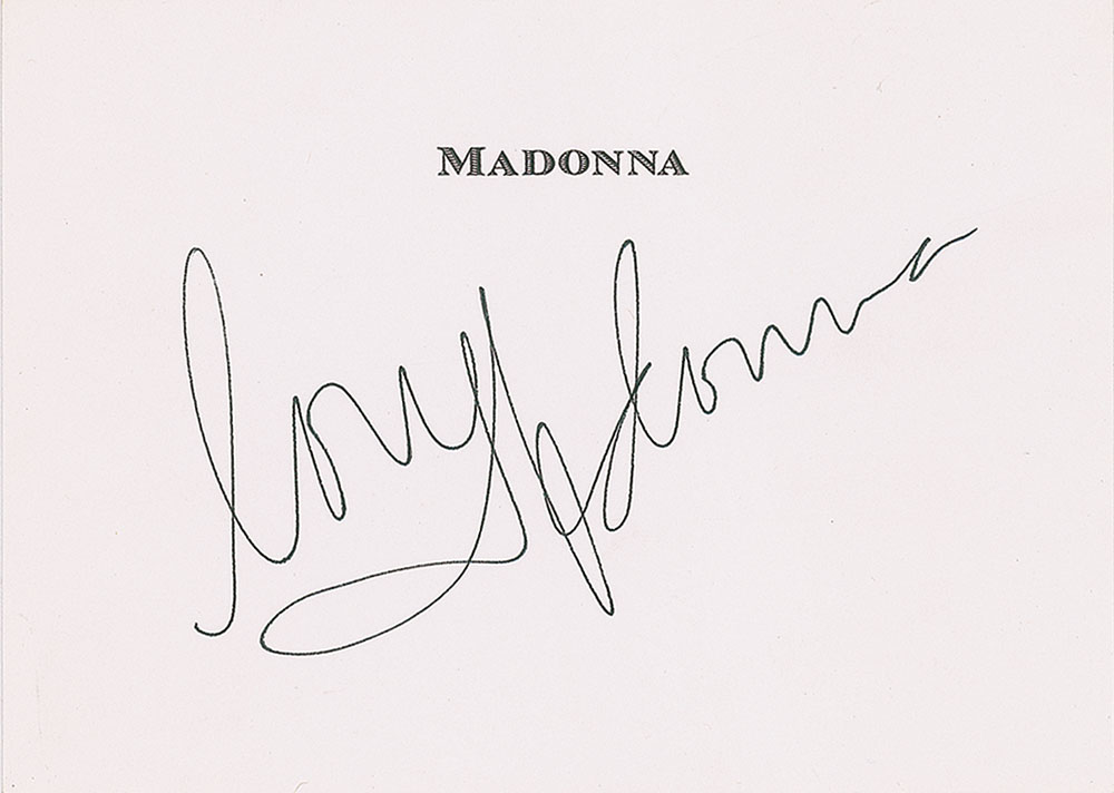 Attractive ink signature, "Love, Madonna,” on a white 6.25 x 4.5 sheet of her personal stationery. In very fine condition. Accompanied by a letter of provenance from Madonna's former art advisor, Darlene Lutz.