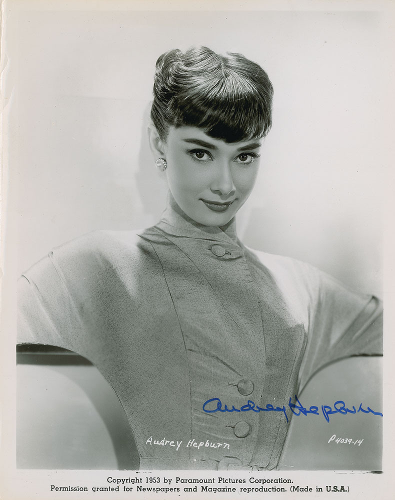 Very desirable glossy 8 x 10 promotional photo of Audrey Hepburn for Paramount Pictures in 1953, signed in blue felt tip. In fine condition, with scattered light creasing.