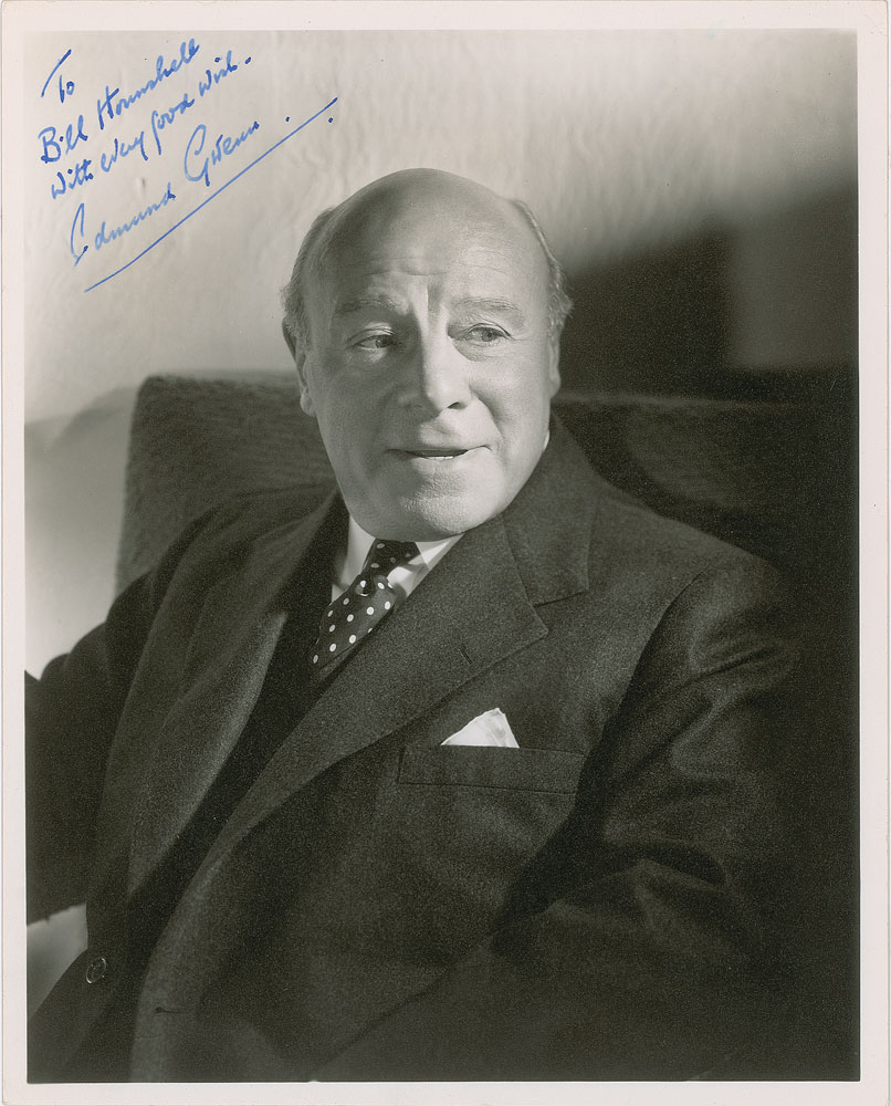 Vintage matte-finish 8 x 10 studio portrait photo of the Oscar-winner in a relaxed pose, signed and inscribed in fountain pen, "To Bill Hounshell, with every good wish, Edmund Gwenn.” In fine to very fine condition.
