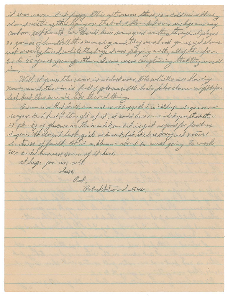 Notorious criminal (1890-1963) who, while imprisoned, became a self-educated authority on birds and earned the nickname 'The Birdman of Alcatraz.' ALS in pencil, signed “Bob, Robert Stroud - 594,” one page both sides, 8 x 10.25, August 14, 1945. Letter written from Alcatraz, in part: "I had a nice letter from ark the other day and it seems that everything is going to be O.K. with the book?He says that he now has things well organized and that the book campaign is rolling. Of course it will be six weeks before we can have any indication of the response, but I am sure that it will be good. The sales have held up well under the limited advertizing I have been using up until this time. We sold $108.00 worth last month, and July is always a very poor month. August is always poor, too, but things should begin to pick up in September?We are having our winter now. Out in the yard this morning it was warm but foggy?Well, I guess the war is at last over. The whistles are blowing now, and the air is full of planes. We had a false alarm night before last, but this sounds like the real thing." Also signed at the head, "Robert Stroud, P.M.B. 594, Alcatraz, California." In fine condition.