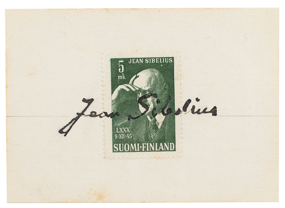 Vintage fountain pen signature, "Jean Sibelius,” over a Finnish postage stamp affixed to an off-white 3.5 x 2.5 card. In fine condition. From the James A. Bowman Collection.