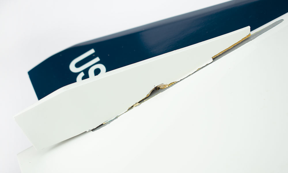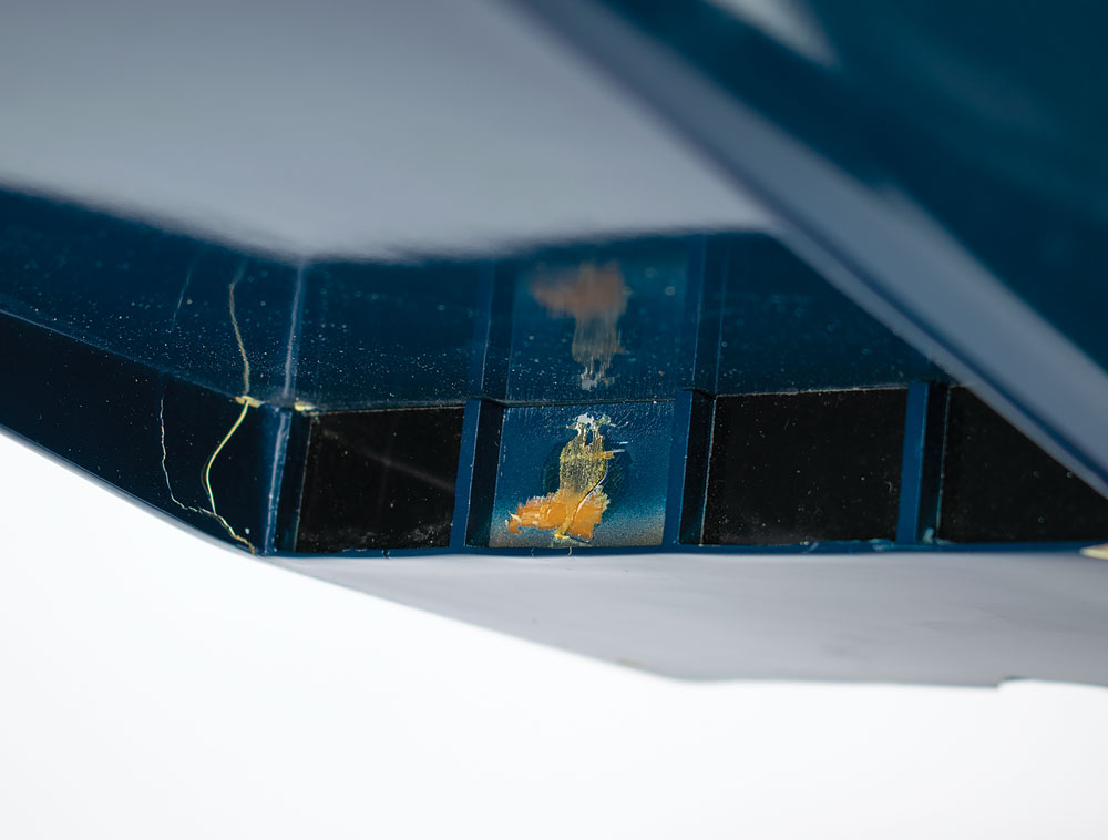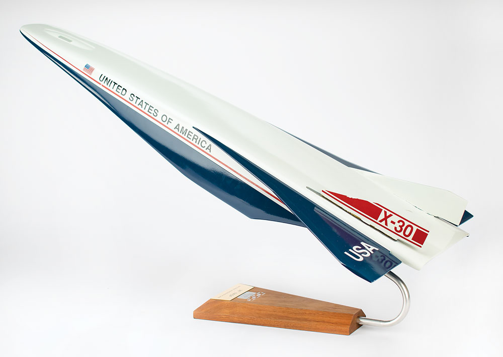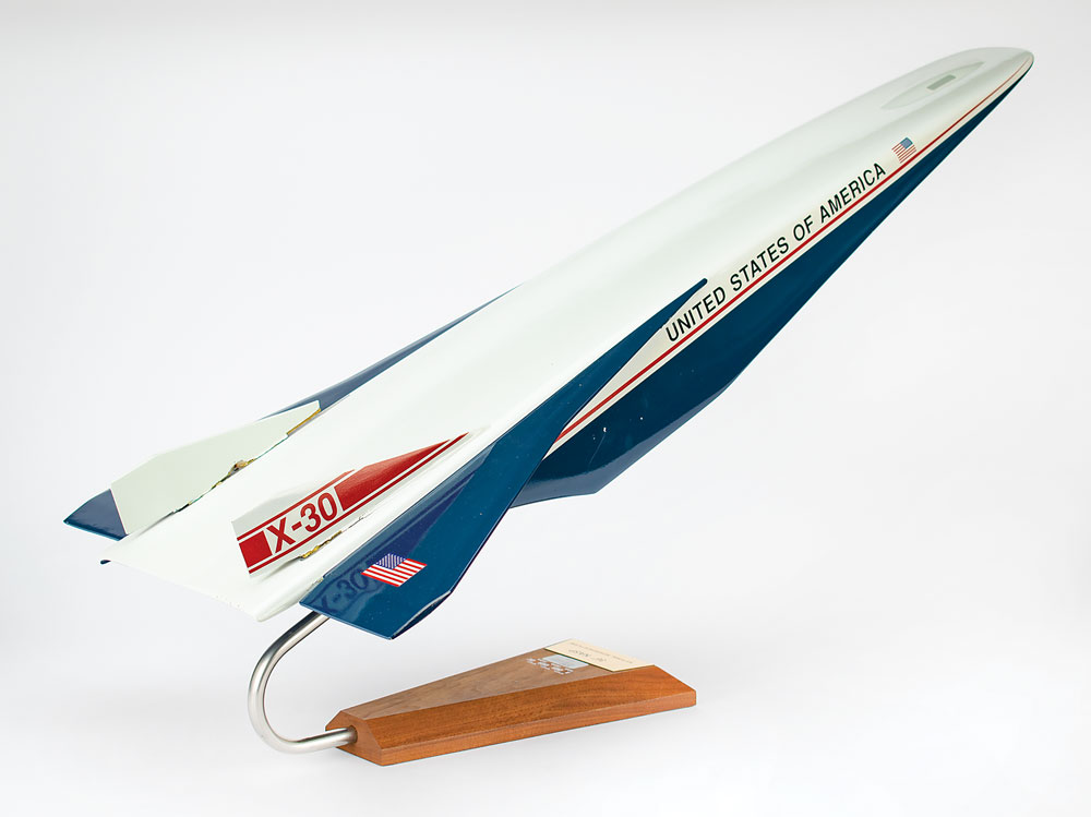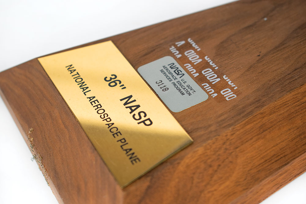 Oversized Rockwell X-30 National Aero-Space Plane (NASP) model made by Penwal Industries, Inc., for NASA's AESP program circa 1982. The fiberglass model measures 36.5″ in length with a wingspan of 17.5″, and is mounted atop a wooden base measuring 11″ x 6″ x 1.25, to a height of 20″; the top of the base is stamped “Void,” and bears an affixed brass plaque that reads, “36″ NASP, National Aerospace Plane,” and a metal NASA “U.S. Gov’t Aerospace Education Services Program” label numbered “3118.” Bottom of base features a Penwal label and is marked in black felt tip, “NASA / AESP, #3118.” The model features various United States decals, with underside featuring a matching AESP label. In very good condition, with left tail fin detached but present; chips and cracks to underside of model, namely where model is mounted to base; a crack to base of right tail fin; and the detached tail fin chipped with some small fragments missing. Accompanied by a large hardshell storage briefcase, which measures 42.5″ x 24.5″ x 8″. The X-30 NASP National Aero-Space Plane was a conceptual single-stage-to-orbit spacecraft that never made it to the prototype phase as the program was canceled in the early 1990s after years of development. It was to be a scram-jet based aircraft, with a maximum speed of Mach 8.