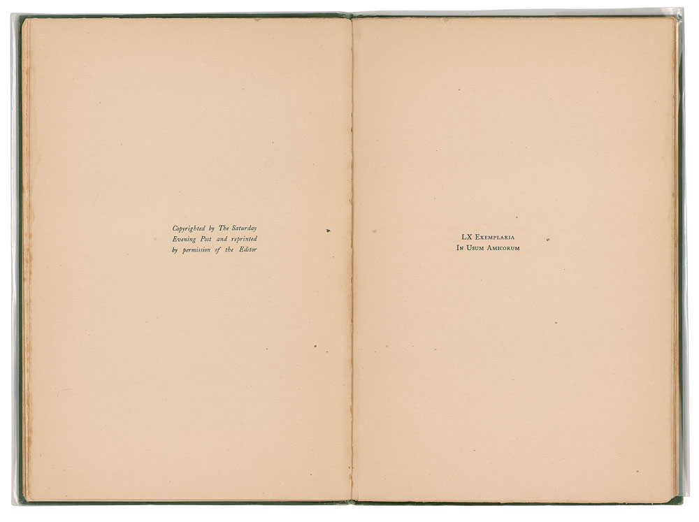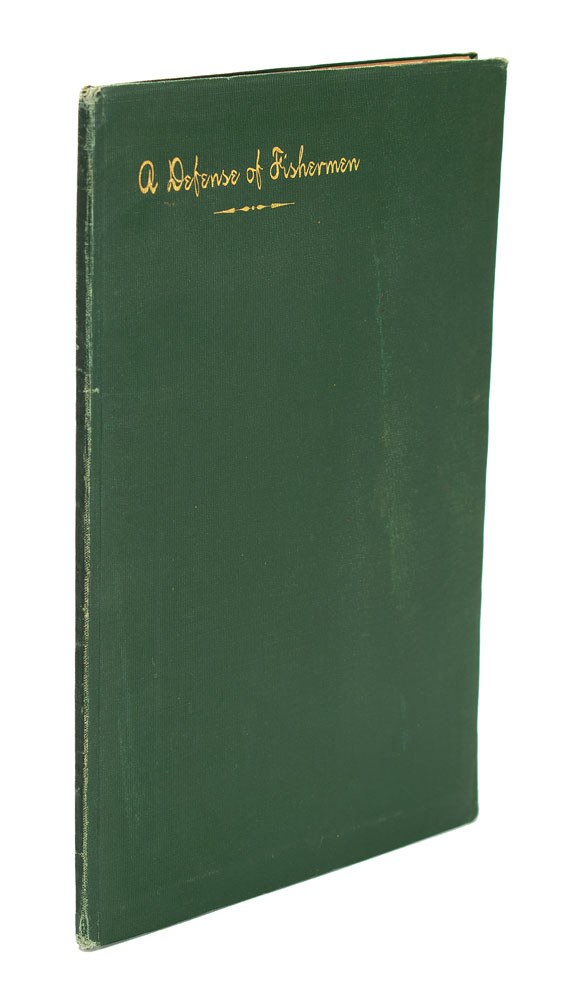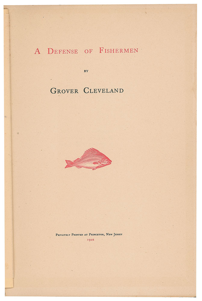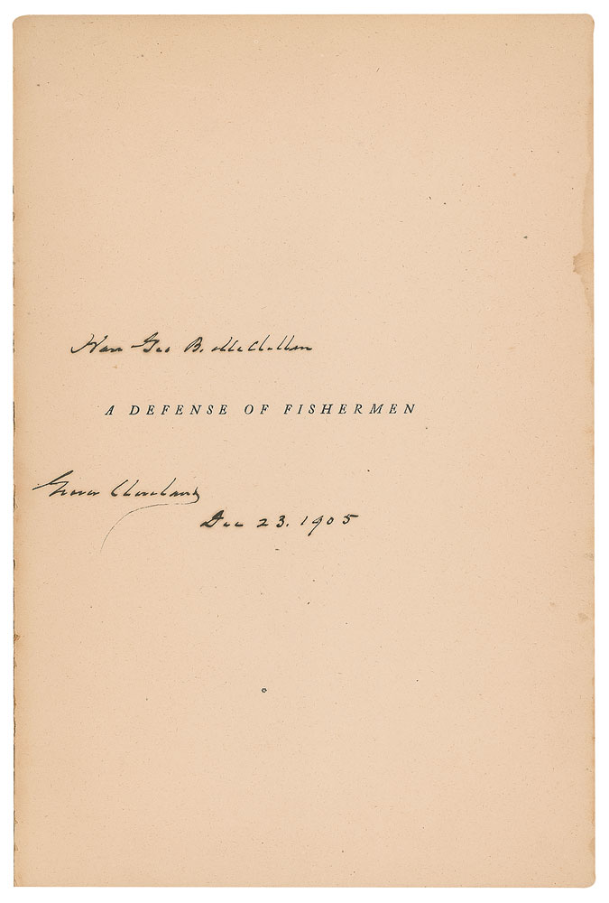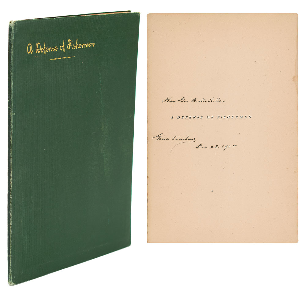 Extremely rare signed book: A Defense of Fishermen. Limited edition, issued as one of 60 copies ["LX Exemplaria in Usum Amicorum"]. Princeton, NJ: Privately Printed, 1902. Bound in stiff original green cloth with gilt stamping, 6.5 x 9.5, 14 pages. Signed and inscribed on the half-title page in ink, "Hon. Geo. B. McClellan, Grover Cleveland, Dec. 23, 1905." Autographic condition: fine, with a slight stain to the right edge of the signed page. Book condition: VG/None, with light edgewear and slight separation at gutter. In this essay originally published in the Saturday Evening Post, Cleveland humorously touches upon some of fishing's great tropes, explaining why fish stories should be believed, and why the biggest fish is always lost. The recipient of this volume, George B. McClellan, Jr., was the son of the famed Civil War general, and served as mayor of New York City from 1904 to 1909.