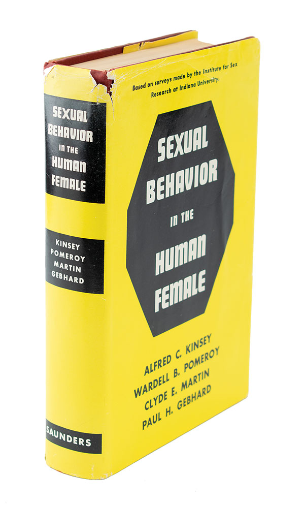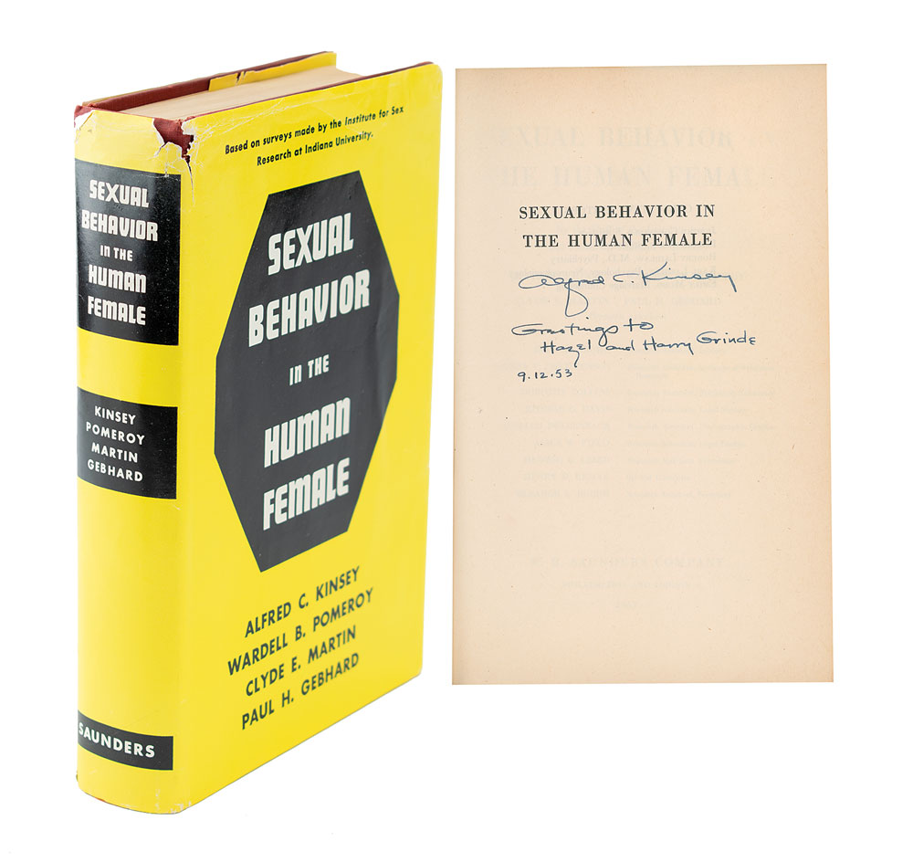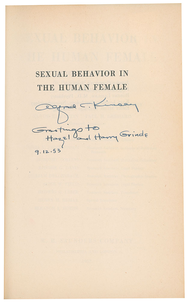Signed book: Sexual Behavior in the Human Female. First edition. Philadelphia and London: W. B. Saunders, 1953. Hardcover with dust jacket, 6.5 x 9.5, 842 pages. Signed and inscribed on the half-title page in fountain pen, "Alfred C. Kinsey, Greetings to Hazel and Harry Grinde, 9.12.53." Autographic condition: fine. Book condition: VG/VG, with wear to the spine tail, chips to the head of the jacket's spine, and a price-clipped front flap.