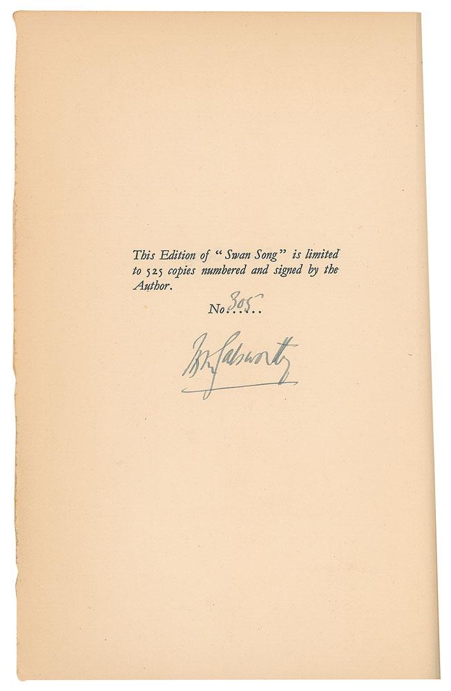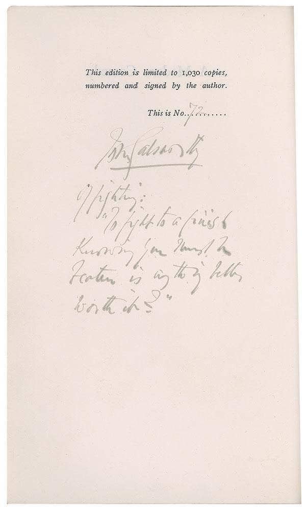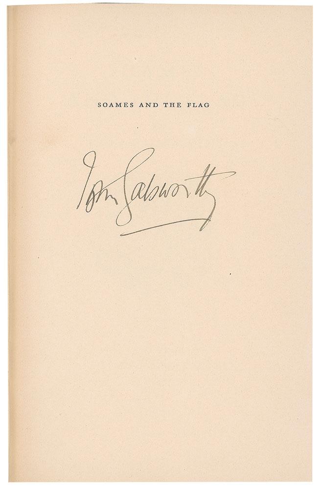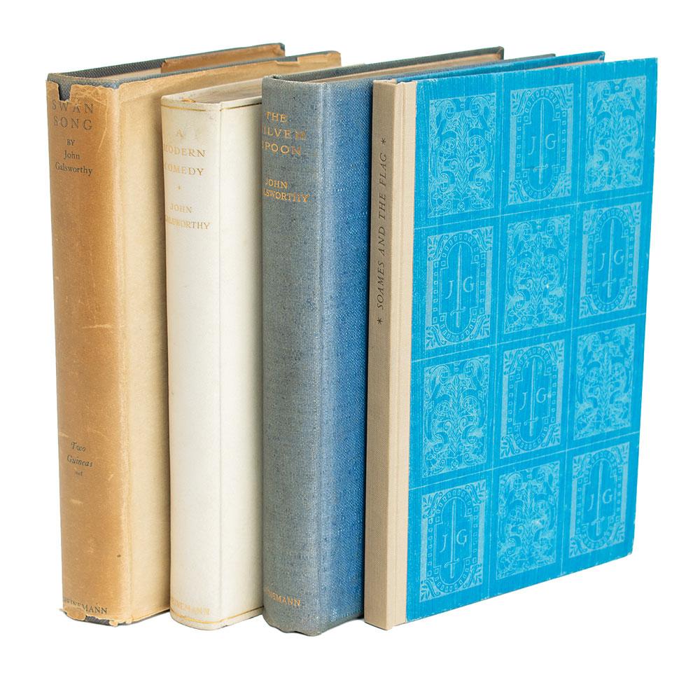 Four limited edition books signed by the Nobel Prize-winning writer: a hardcover edition of The Silver Spoon, numbered 14/265, signed on the colophon in ink; a slipcased edition of Soames and the Flag, numbered 181/680, signed on the half-title page in ink; a hardcover edition of Swan Song, with dust jacket, numbered 305/525, signed on the colophon in ink; and a limited edition of A Modern Comedy bound in stiff vellum, numbered 72/1030, signed on the colophon in ink, "John Galsworthy, On Fighting: 'To fight to a finish knowing you must be beaten is anything better worth it?'" In overall very good to fine condition, with some soiling, sunning, and toning.