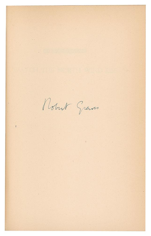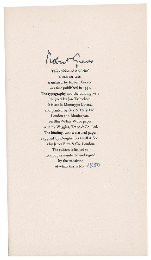 Three books signed by Graves: a slipcased limited edition of his translation of The Golden Ass by Lucius Apuleius, numbered 1250/2000, signed on the colophon in fountain pen; a first edition of Watch the Northwind Rise, hardcover with dust jacket, signed on a free end page in fountain pen; and a limited edition of Timeless Meeting, numbered 506/536, signed on the colophon in fountain pen. In overall fine condition, with some wear and toning to The Golden Ass slipcase. Accompanied by a custom-made half morocco case for the Timeless Meeting book, which is bumped on the top edge.