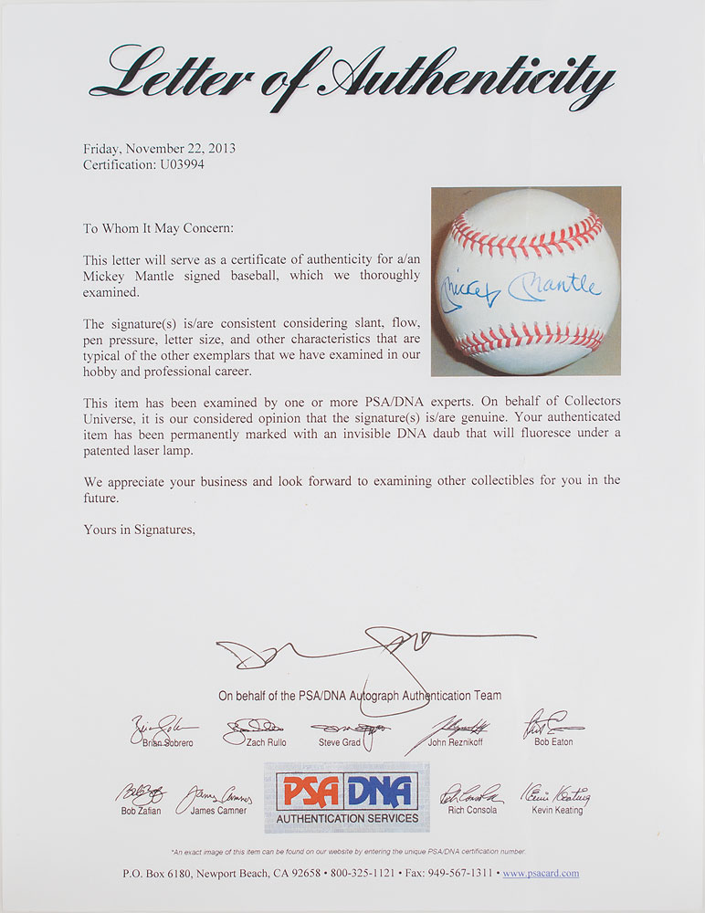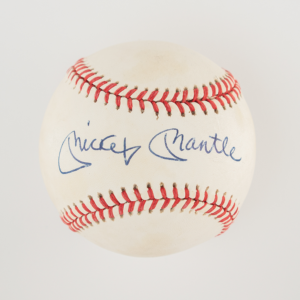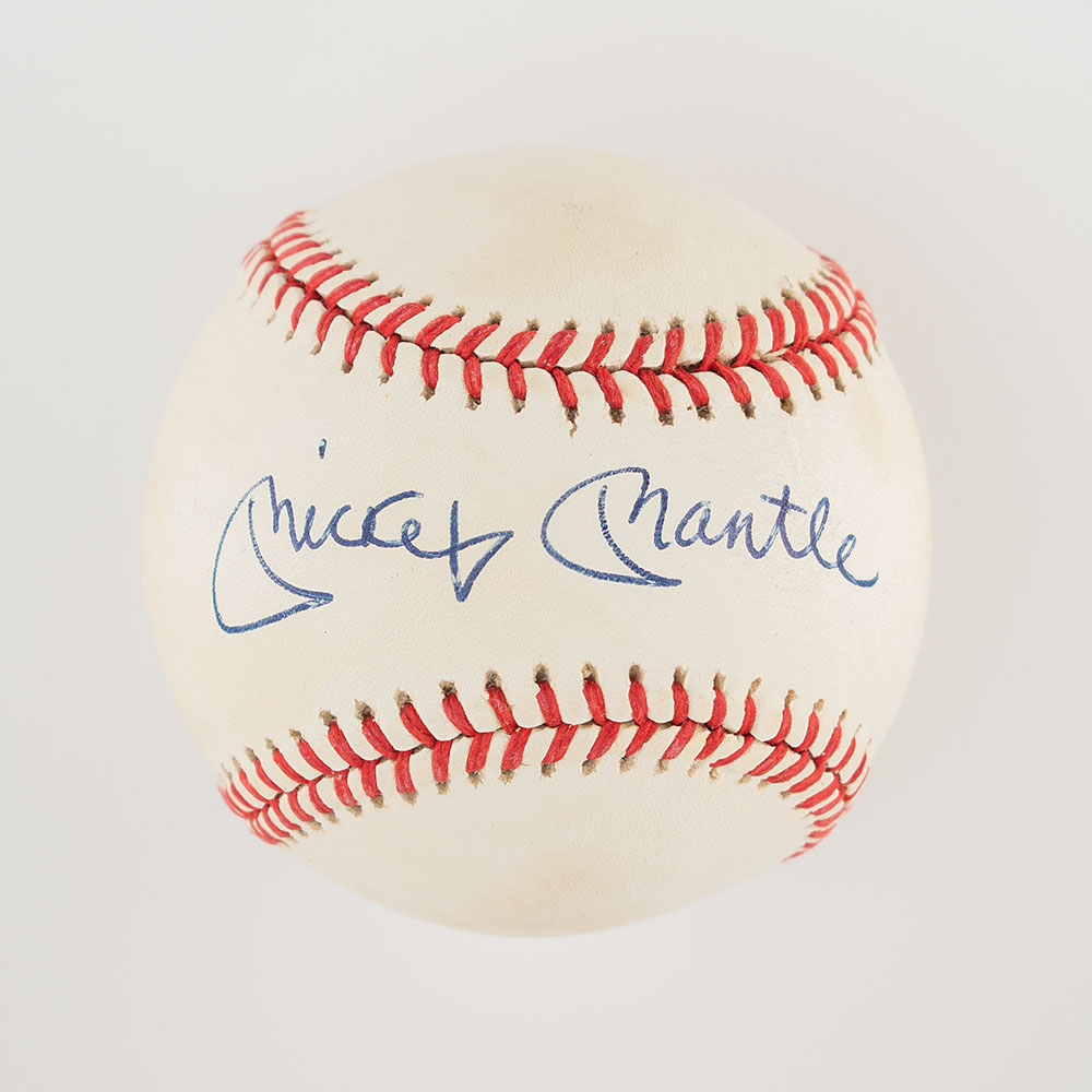 Official Rawlings American League (Brown) baseball signed in blue ballpoint on the sweet spot by New York Yankees Hall of Fame outfielder Mickey Mantle. In fine condition, with some light toning. Accompanied by a full letter of authenticity from PSA/DNA.