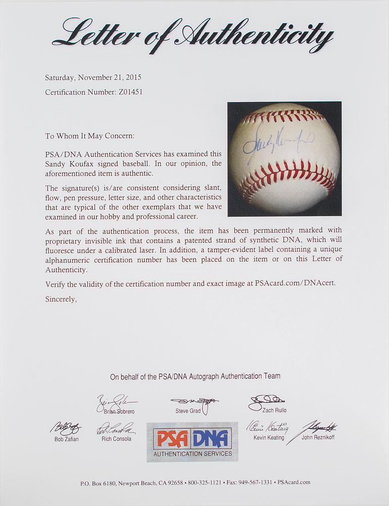 Pair of official National League (White) baseballs, individually signed on the sweet spot in blue ballpoint by Sandy Koufax and Don Drysdale, both Dodger Hall of Fame pitchers. In overall very good to fine condition, with slight soiling to the Drysdale ball. Accompanied by full letters of authenticity from JSA and PSA/DNA.