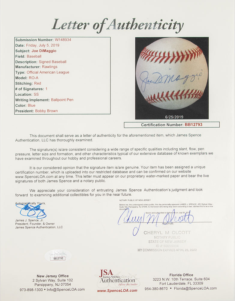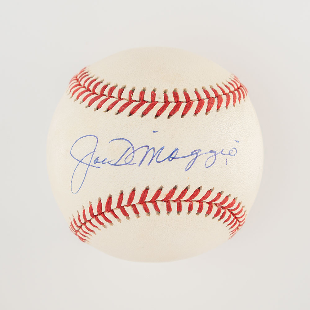 Official Rawlings American League (Brown) baseball signed on the sweet spot in black ballpoint by New York Yankees Hall of Famer Joe DiMaggio. In fine condition. Accompanied by a full letter of authenticity from JSA.