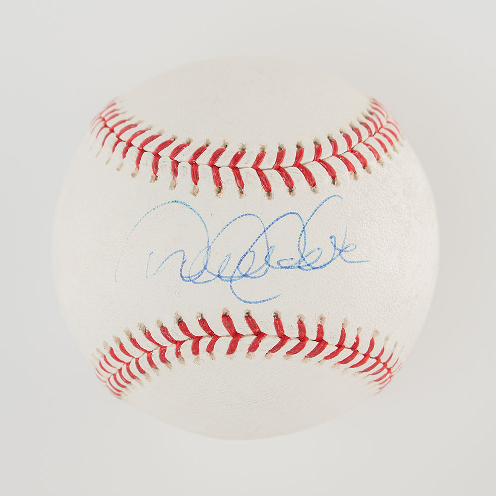 Official Rawlings Major League (Selig) baseball signed in blue ballpoint on the sweet spot by New York Yankees captain and Hall of Famer Derek Jeter. In fine condition, with some light soiling and an affixed Steiner hologram.
