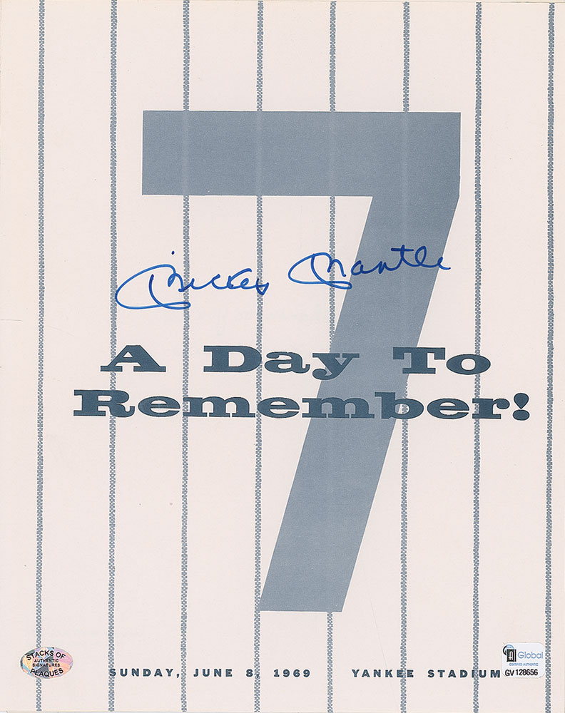 Fold-out program for "A Day to Remember," an event honoring the retirement of Mickey Mantle on June 8, 1969, at Yankee Stadium, two pages, 8 x 10, signed on the front cover in blue felt tip by Mantle. In fine condition, with covers detached and two authenticity labels affixed to lower corners of front cover. Accompanied by a full letter of authenticity from JSA.