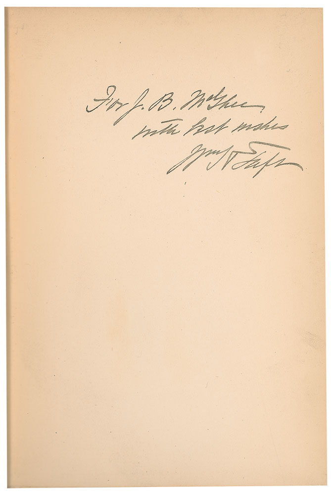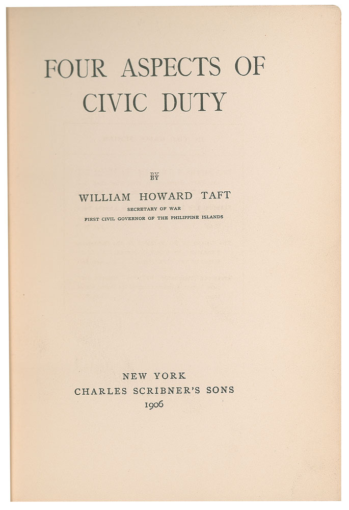 Signed book: Four Aspects of Civic Duty. First edition. NY: Charles Scribner's Sons, 1906. Hardcover, 5.25 x 7.75, 111 pages. Neatly signed and inscribed on the first free end page in fountain pen, "For J. B. McGhee, with best wishes, Wm. H. Taft." Autographic condition: fine. Book condition: VG/None, with minor edgewear.