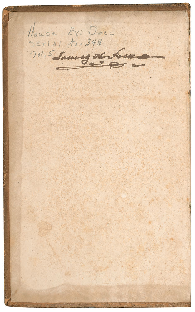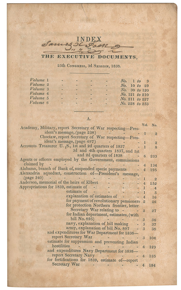 Signed book: Index to the Executive Documents, 25th Congress, 3d Session, 1838. Washington, DC: Government Printing Office, 1838. Leatherbound hardcover, 6.25 x 9.25, 695 pages. Signed on the front pastedown in ink, "James K. Polk," and on the first page, "James K. Polk." Autographic condition: very good condition, with light overall staining, short edge tears, and notations to the signed pages. Book condition: VG-/None, with heavy scuffing and wear to exterior, ex-Tennessee State Library stamps and notations, and some creasing to textblock.