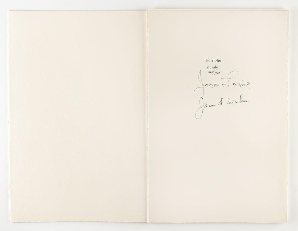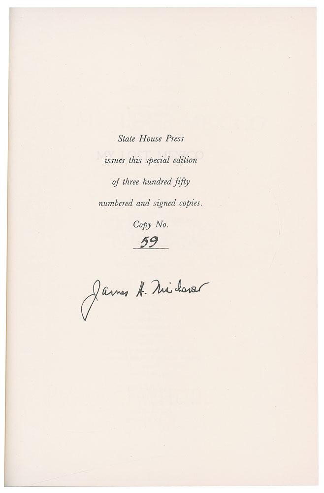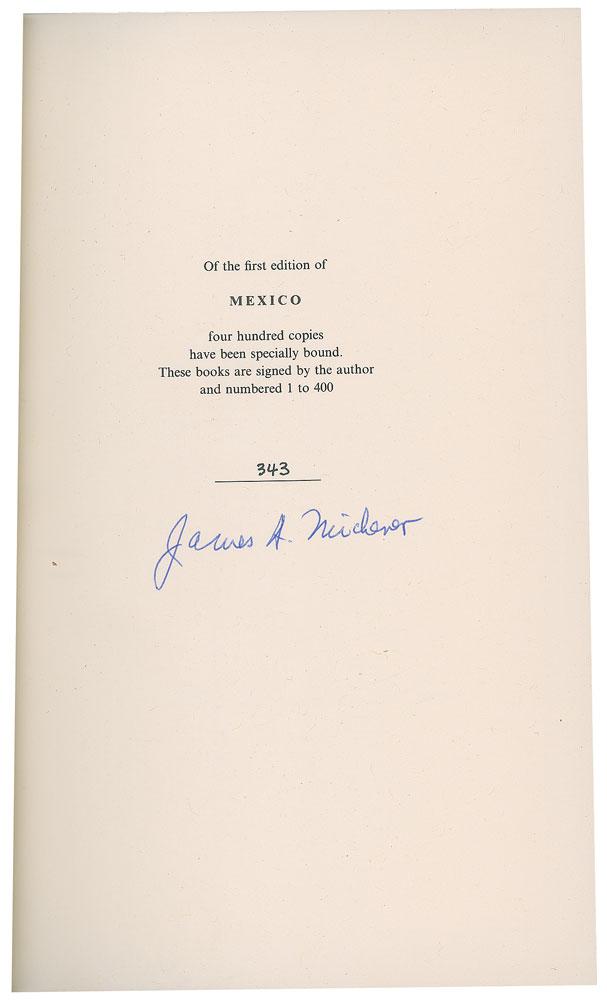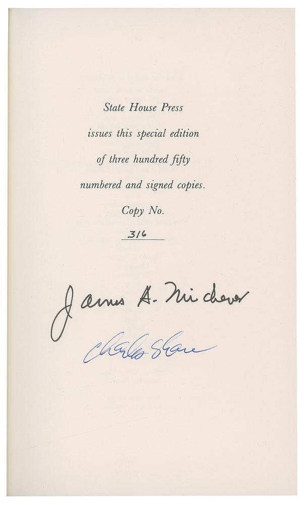 Five books signed by Michener, including: a slipcased limited edition of Mexico, numbered 343/400, signed on the colophon in blue ballpoint by Michener; a slipcased limited edition of My Lost Mexico, numbered 59/350, signed on the colophon in black ink by Michener; a slipcased limited edition of The Eagle and The Raven, numbered 316/350, signed on the colophon in felt tip by Michener and illustrator Charles Shaw; a later printing of Chesapeake, hardcover with dust jacket, signed and inscribed on the title page in blue ballpoint by Michener; and a limited edition oversized lithograph suite entitled Facing East, in its clamshell box, numbered 2259/2500, signed on the colophon in ink by Michener and artist Jack Levine. In overall fine condition, with foxing to the box for Facing East.