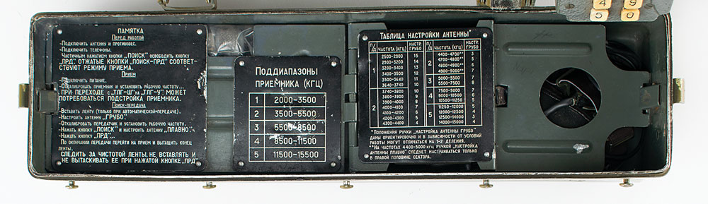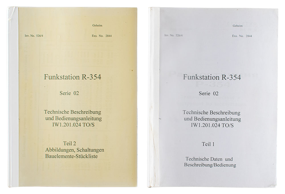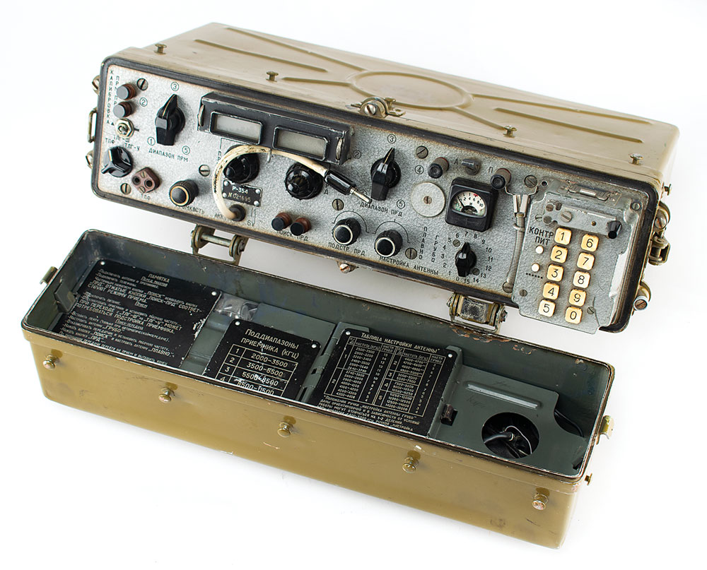 Cold War-era R-354 spy radio set, codenamed 'Shmel [Bumblebee],' used by spies and special forces of the USSR for reconnaissance purposes. The fully self-contained unit measures 16″ x 12″ x 4.25″. It contains a receiver, transmitter, antenna, and burst transmitter. The built-in burst encoder—a ten-button panel on the right side—allowed pre-coded numerical messages to be sent very rapidly, minimizing the risk of interception. The radio could be operated by a 6V battery stored in the lid, a hand-cranked generator, or an external power supply. The main panel features controls for receiving and transmitting calibration, tuning, and volume, and readouts for tuning frequencies. In very good to fine condition. Accompanied by two modern manuals in German. A desirable example of the spy radio that saw the most widespread use by the Warsaw Pact countries during the Cold War.
