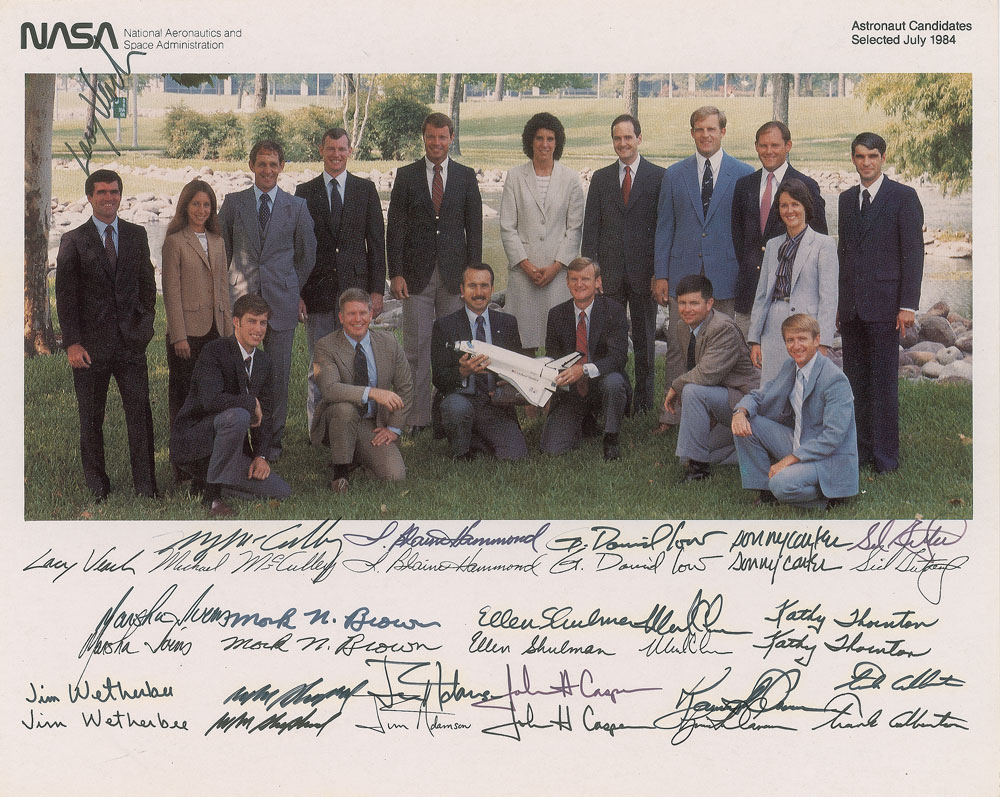 Official color 10 x 8 NASA lithograph of the 17 astronaut candidates selected as part of NASA group 10 in 1984, signed in ink or felt tip by all pictured candidates, including: Kenneth Cameron, John Casper, Frank Culbertson, Sidney Gutierrez, Blaine Hammond, Michael McCulley, James Wetherbee, James Adamson, Ellen Baker, Mark Brown, Sonny Carter, Marsha Ivins, Mark Lee, David Low, William Shepherd, Kathryn Thornton, and Charles "Lacy" Veach. In fine condition.