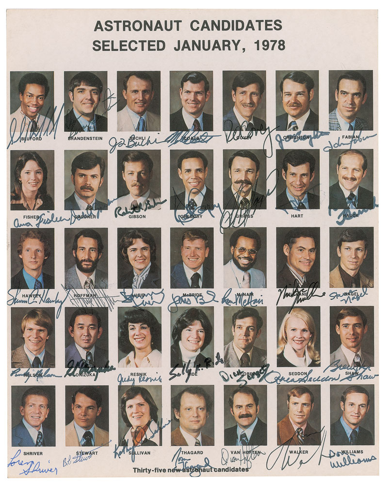 Official color 8 x 10 NASA lithograph of the 35 astronaut candidates selected as part of NASA group eight in 1978, signed in ink or felt tip by all pictured candidates, including: Ron McNair, Ellison Onizuka, Judy Resnik, Sally Ride, Rhea Seddon, Dan Brandenstein, Michael Coats, Dick Covey, John Creighton, Robert Gibson, Frederick D. Gregory, Frederick Hauck, Jon McBride, Dick Scobee, Brewster Shaw, Loren Shriver, David Walker, Donald Williams, Guion Bluford, James Buchli, John Fabian, Anna Fisher, Dale Gardner, S. David Griggs, Terry Hart, Steven Hawley, Jeffrey Hoffman, Shannon Lucid, Richard Mullane, Steven Nagel, George Nelson, Robert Stewart, Kathryn D. Sullivan, Norman Thagard, and James van Hoften. In fine condition.