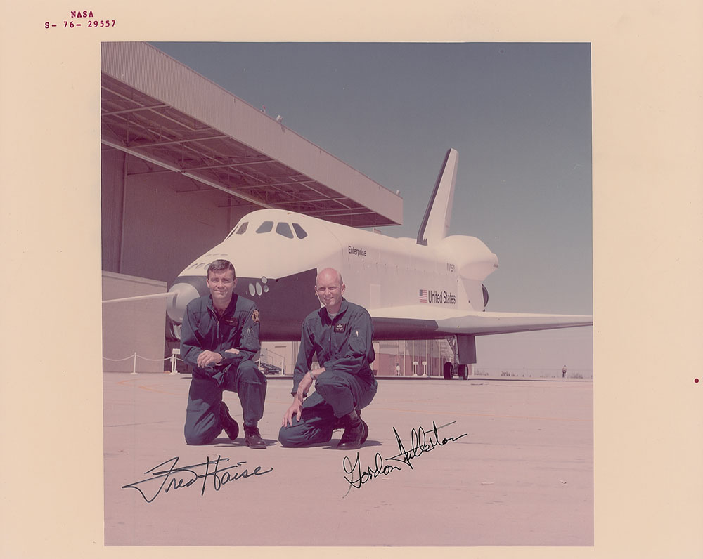 Official color semi-glossy 10 x 8 red-numbered NASA photo of the first Approach and Landing Tests crew kneeling in front of the Enterprise orbiter, signed in black ink by Fred Haise and Gordon Fullerton. Reverse bears faded purple NASA caption text and "This Paper Manufactured by Kodak" watermarks. In very fine condition.