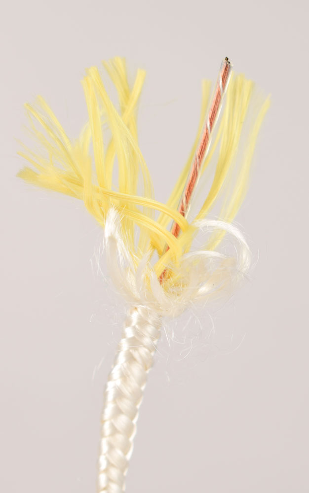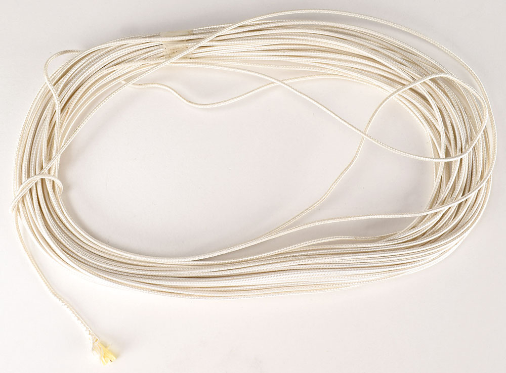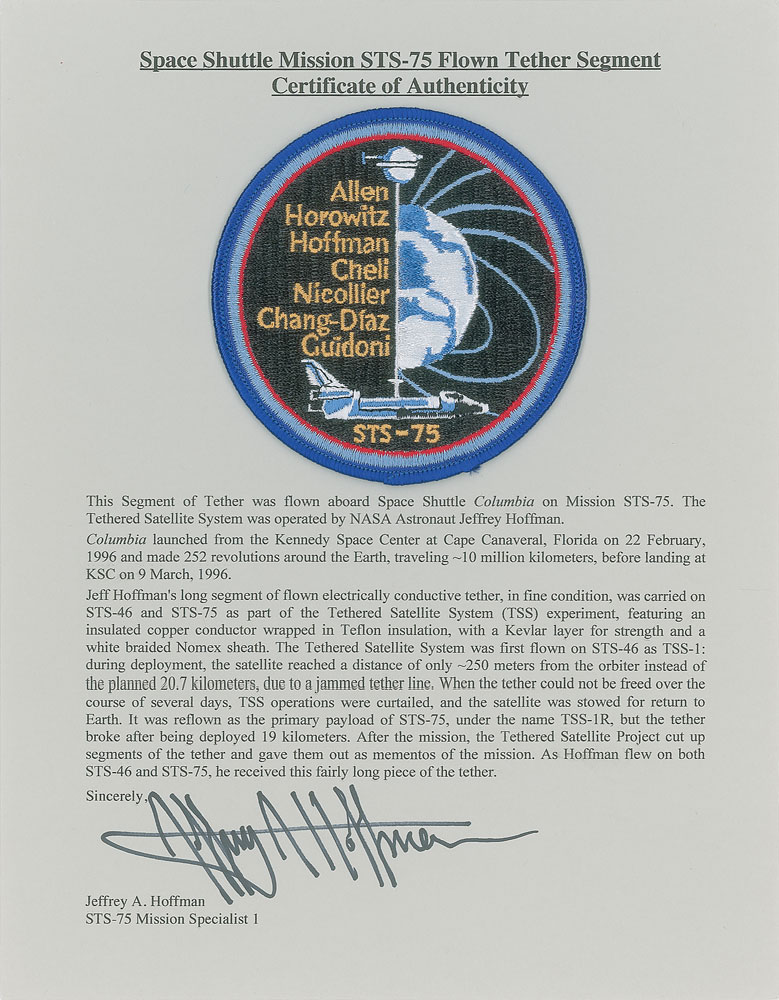 Jeff Hoffman's long segment of flown electrically conductive tether carried on STS-46 and STS-75 as part of the Tethered Satellite System (TSS) experiment, featuring an insulated copper conductor wrapped in a white braided Nomex sheath. In fine condition. The Tethered Satellite System was first flown on STS-46 as TSS-1: during deployment, the satellite reached a distance of only 860 feet from the orbiter instead of the planned 20.7 kilometers due to a jammed tether line. When the tether could not be freed over the course of several days, TSS operations were curtailed, and the satellite was stowed for return to Earth. It was reflown as the primary payload of STS-75, under the name TSS-1R, but the tether broke after being deployed 19 kilometers. After the mission, the Tethered Satellite Project cut up segments of the tether and gave them out as mementos of the mission. As Hoffman flew on both STS-46 and STS-75, he received this fairly long piece of the tether.