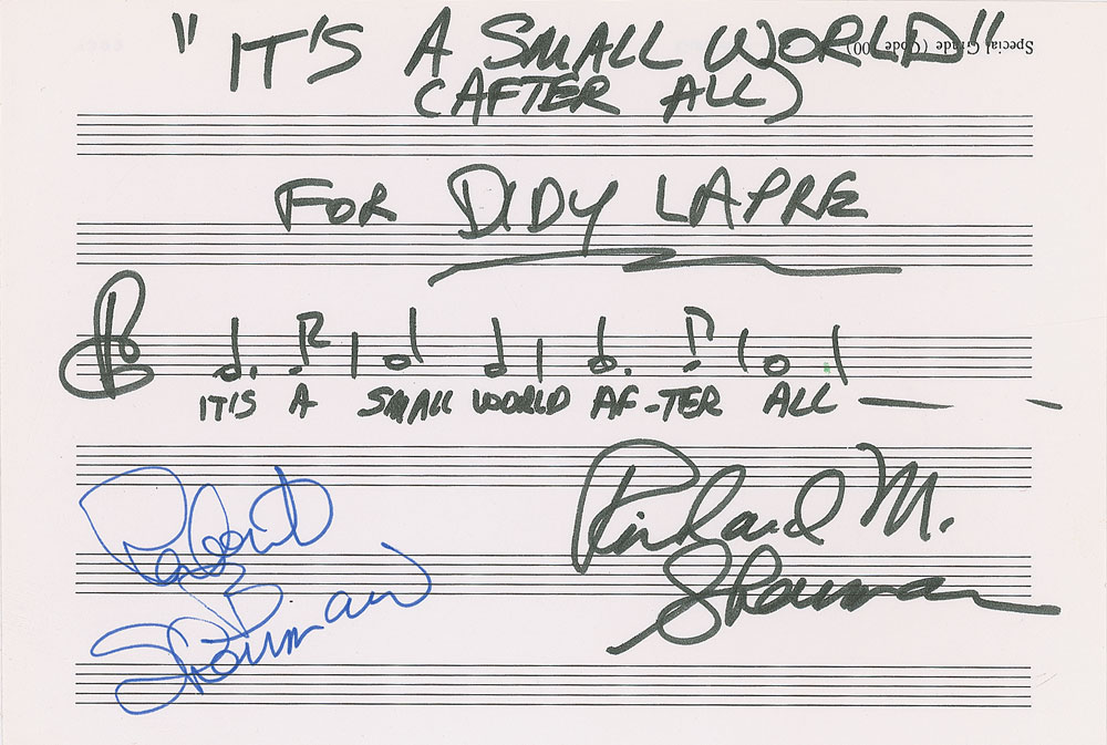 AMQS on a white 9 x 6 musically-lined sheet, written out in black felt tip by Richard Sherman, and titled, signed, and inscribed, "'It's a Small World (After All),' for Didy Lapre, Richard M. Sherman," and signed in the lower left in black felt tip by his brother and song-writing partner, "Robert Sherman." In very fine condition.