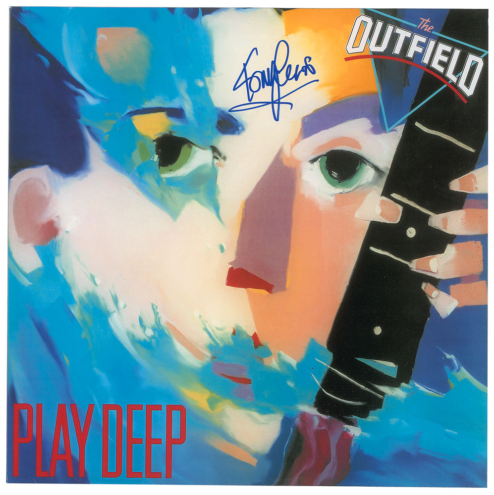 Play Deep album by The Outfield, signed on the front cover in blue felt tip by Tony Lewis. In fine condition. The record is not included.