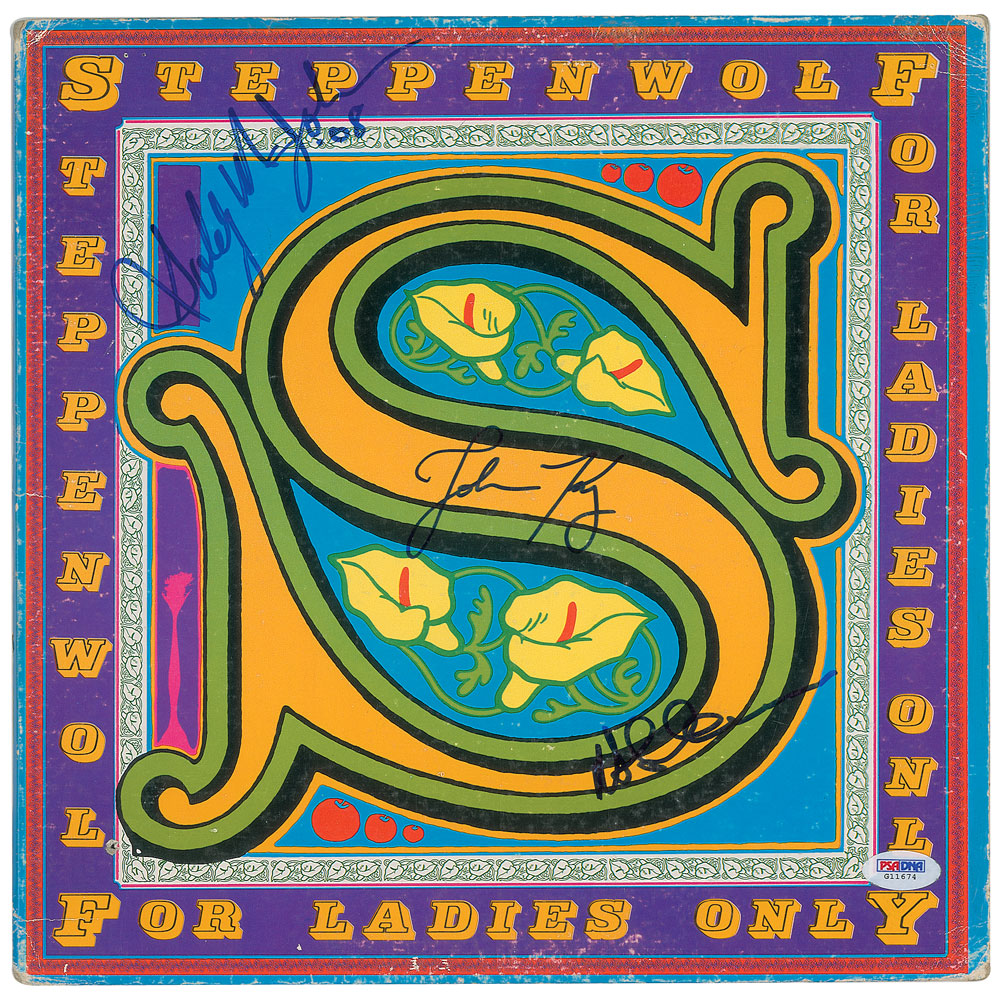 For Ladies Only album by Steppenwolf, signed on the front cover in blue felt tip by Goldy McJohn, John Kay, and Nick St. Nicholas. In very good to fine condition, with light scuffing and scratching, and a PSA/DNA label affixed to lower right corner (certificate not present). The record is not included.