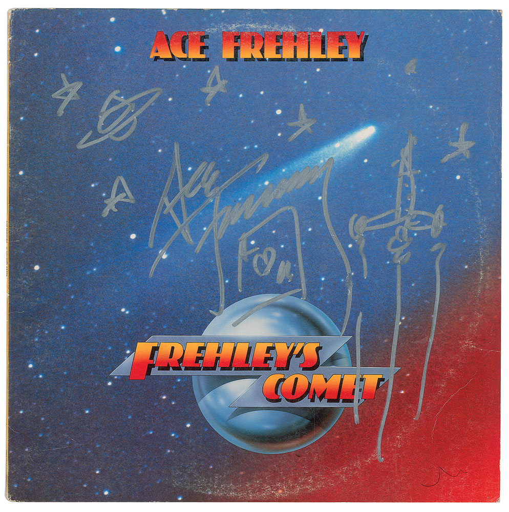 Frehley's Comet album, signed on the front cover in silver ink by Ace Frehley, who adds a playing card, a rocket ship, and a planet with surrounding stars. In fine condition, with light scuffing. The record is included.