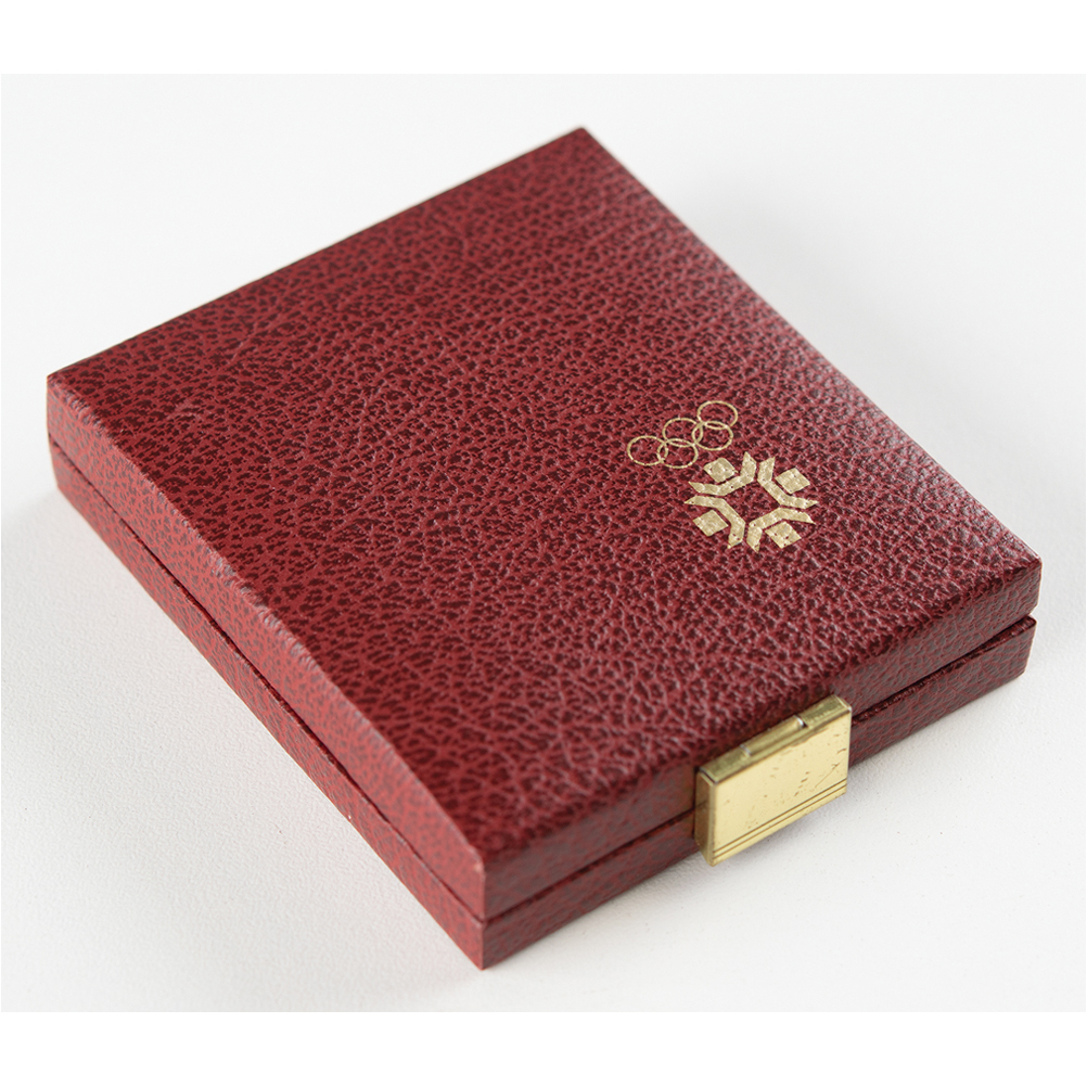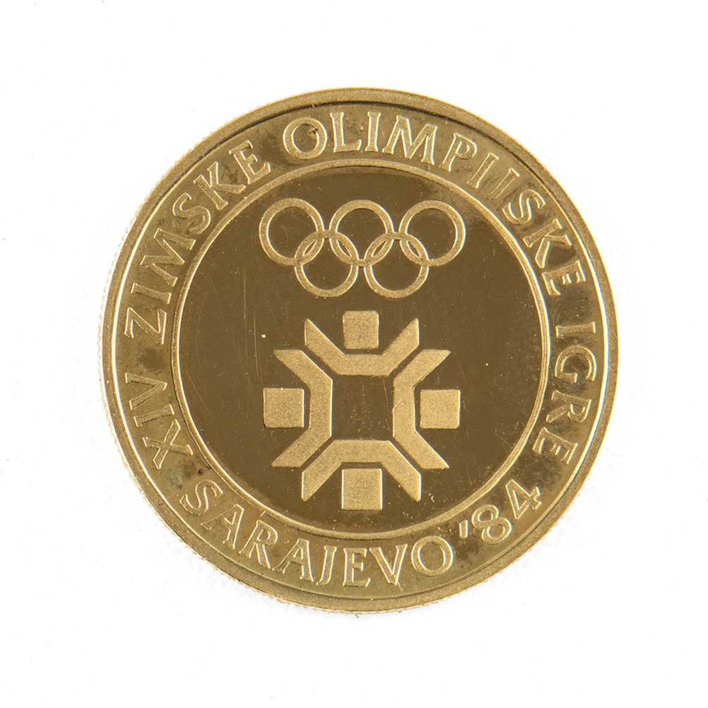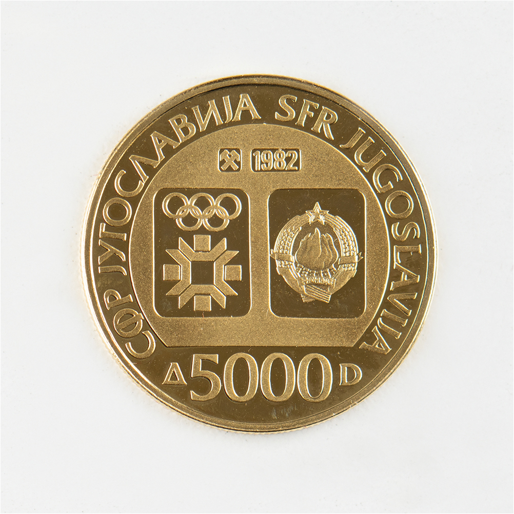 5,000 Dinara gold proof coin issued by the National Bank of Yugoslavia for the Sarajevo 1984 Winter Olympics, 24 mm, 8 gm, 500 fine gold, with front featuring the Sarajevo Games logo encircled with text (translated): "Sarajevo '84, XIV Games of the Winter Olympics"; and the reverse bearing the official logo, the Yugoslavian coat of arms, the denomination, and the date, "1982." Includes the original leather presentation case and multilingual booklet. Accompanied by a commemorative coin from the Seoul 1988 Summer Olympics, nickel, 31 mm, 17 gm, with original paper presentation box and maroon bag.