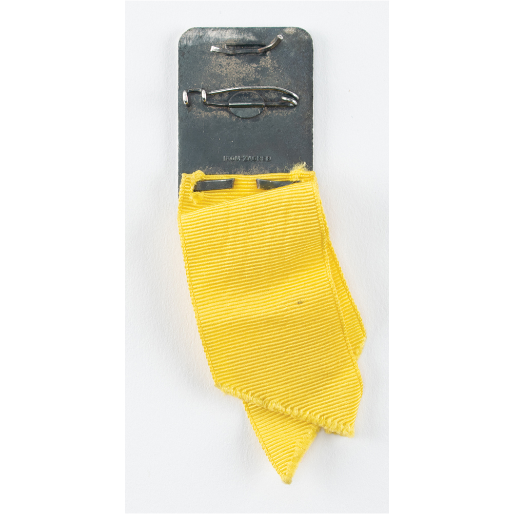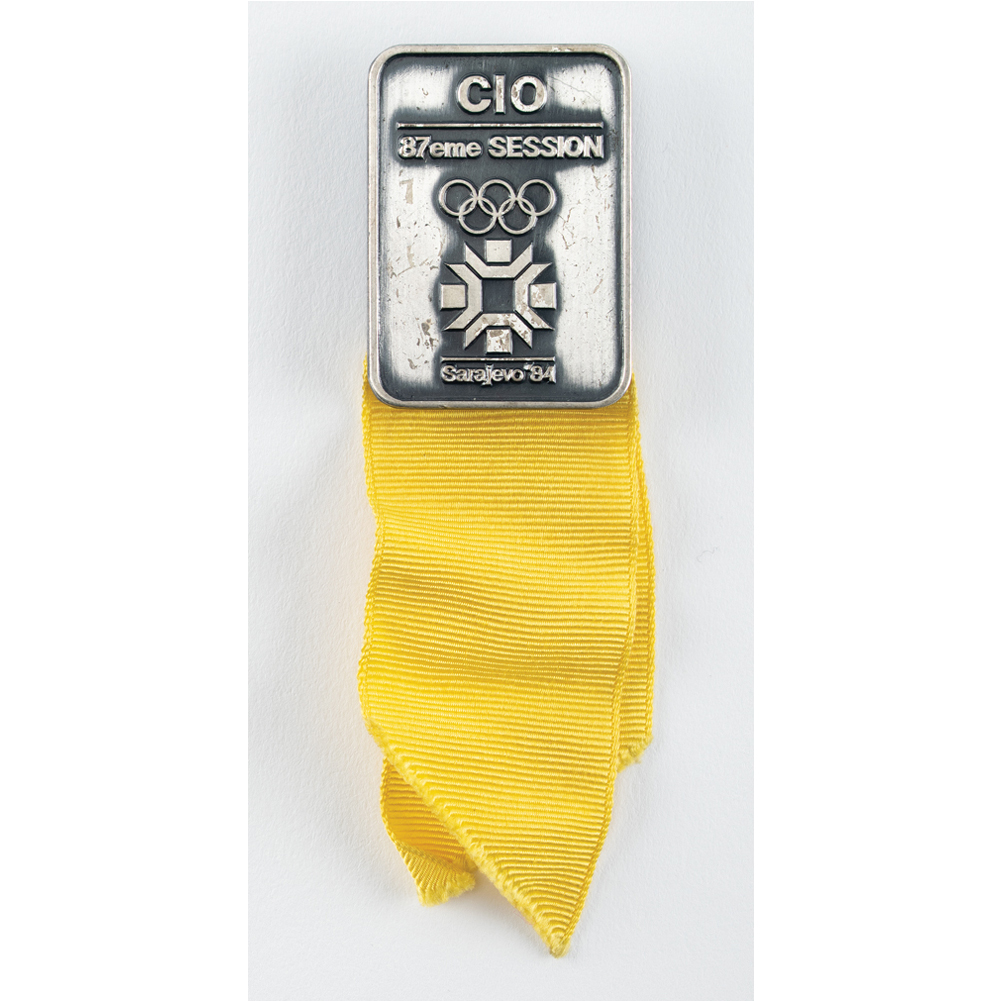 Uncommon French International Olympic Committee (CIO) session badge for TV from the 87th IOC Session held following the Sarajevo 1984 Winter Olympics in March 1984. The silver-tone badge, 31 mm x 38 mm, 18 gm, features the raised Olympic rings and Sarajevo Games logo with upper text: "CIO, 87eme Session." A yellow ribbon extends an additional 63 mm. Made at the IKOM medal factory in Zagreb. In fine condition. Decisions at the 87th IOC meeting included extending the Calgary 1988 Games to 16 days, adding curling, freestyle skiing, and short-track speed-skating to the program, and modifying the opening and closing ceremonies for the Los Angeles 1984 Games.