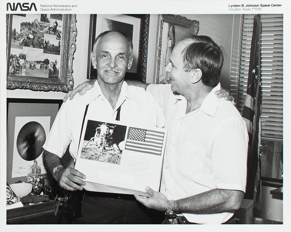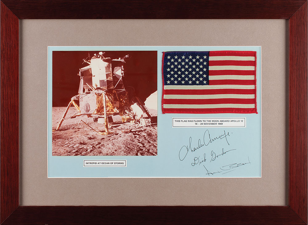Superb flown 6 x 4 fabric American flag carried to the moon on the Apollo 12 mission, affixed to a light blue 13.5 x 8.5 presentation mount, neatly signed below in black felt tip by the crew, "Charles Conrad, Jr.," "Dick Gordon," and "Alan L. Bean." Affixed below the flag is a typed caption, "This flag was flown to the moon aboard Apollo 12, 14-24 November 1969." On the left side is a photograph of the LM Intrepid at the landing site in the 'Ocean of Storms.' Matted and framed to an overall size of 19.5 x 14.5. In fine condition. Accompanied by an official glossy 10 x 8 NASA photo of LMP Alan Bean presenting this exact display to JSC Staff Photographer Pat Patnesky.