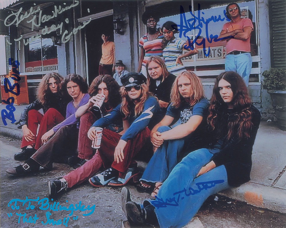 Color glossy 10 x 8 photo of Lynyrd Skynyrd, signed in various inks, "Artimus Pyle," "Leslie Hawkins, 'Tuesday's Gone,'" "Greg T. Walker," "Jo Jo Billingsley, 'That Smell,'" and "Bob Burns." In very fine condition.