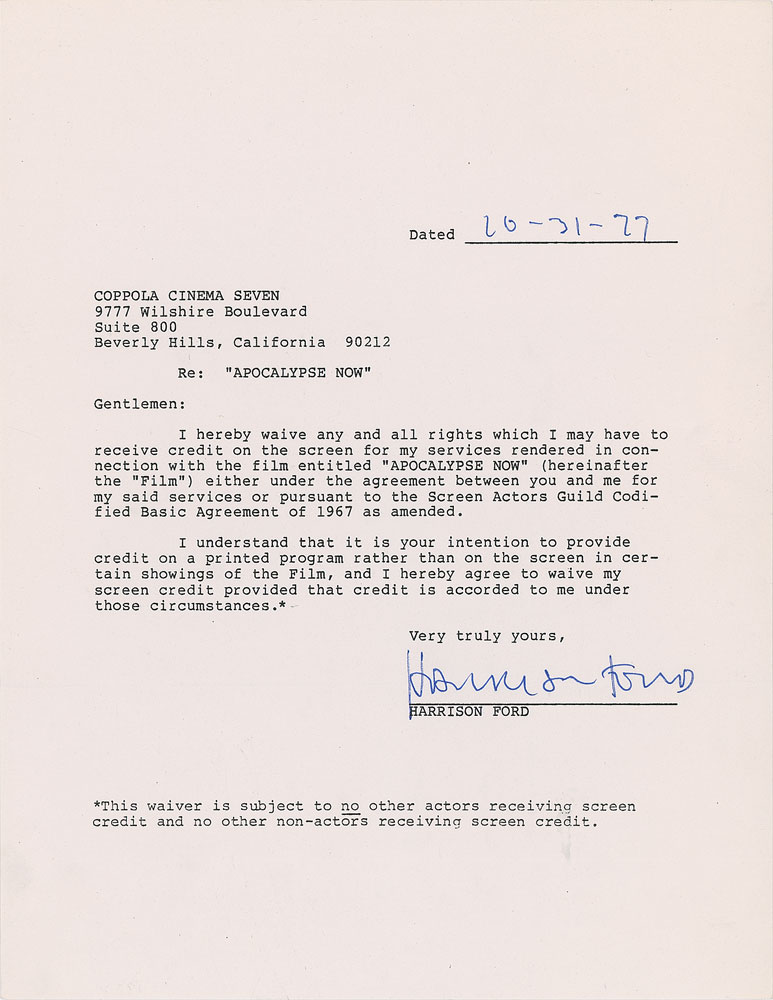 DS, signed “Harrison Ford,” one page, 8.5 x 11, October 31, 1977. Agreement between Ford and Coppola Cinema Seven, in part: "I hereby waive any and all rights which I may have to receive credit on the screen for my services rendered in connection with the film entitled 'Apocalypse Now'?I understand that it is your intention to provide credit on a printed program rather than on the screen in certain showings of the Film, and I hereby agree to waive my screen credit provided that credit is accorded to me under those circumstances?This waiver is subject to no other actors receiving screen credit and no other non-actors receiving screen credit." In fine condition. Ford played the role of 'Colonel Lucas' in a nod to George Lucas, who was originally slated to direct the film but was drawn away by his passion project, Star Wars. Ford, too, would be swept into the Star Wars saga—by the time he signed the present document (October 31, 1977), Star Wars had been in theaters for five months and made him a superstar overnight.