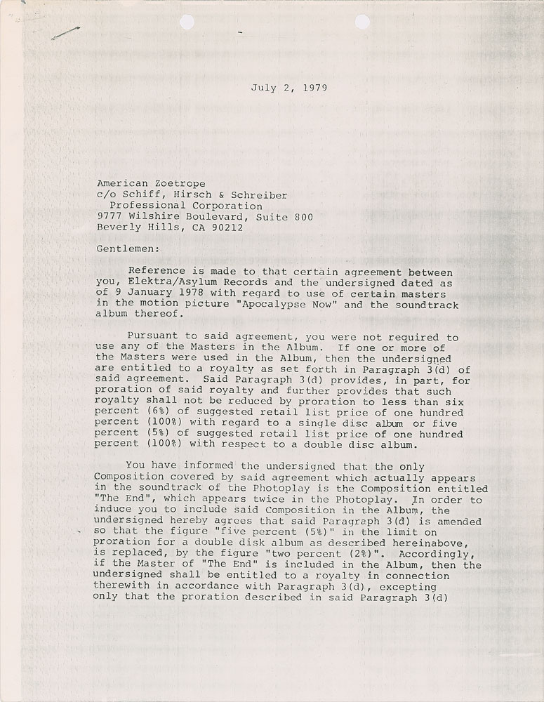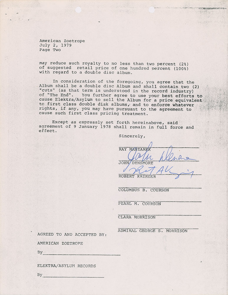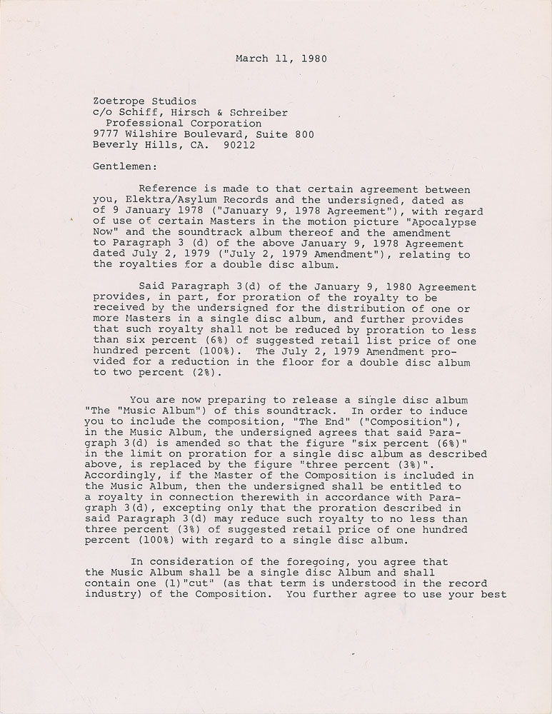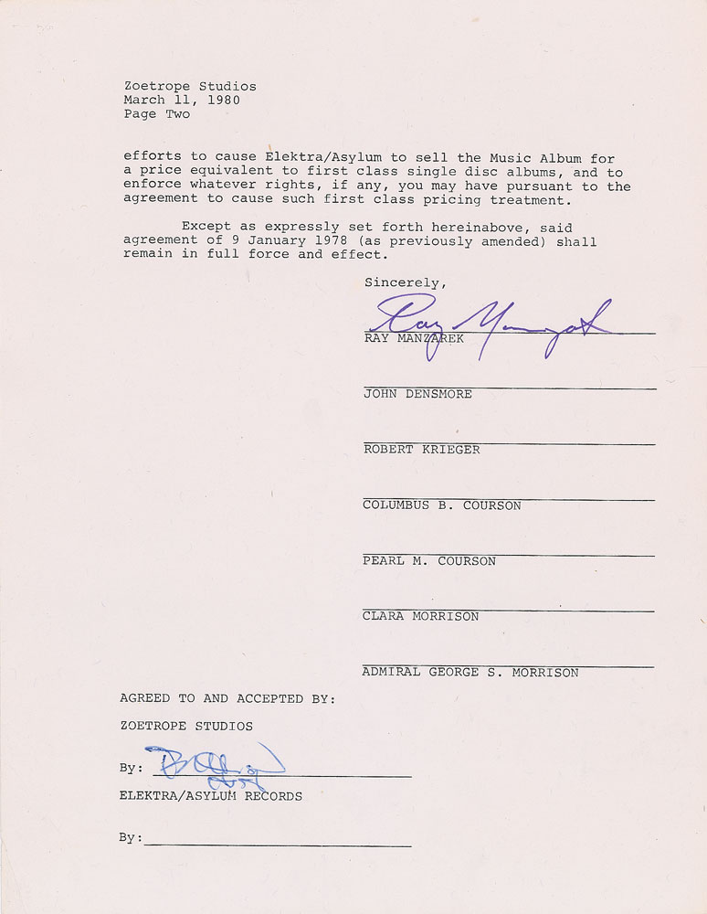 Two agreements between members of The Doors associated with the creation of the Apocalypse Now soundtrack album: the first is signed by John Densmore and Robby Krieger, two pages, 8.5 x 11, July 2, 1979, in part: "Reference is made to that certain agreement between you, Elektra/Asylum Records and the undersigned dated as of 0 January 1978 with regard to use of certain masters in the motion picture 'Apocalypse Now' an the soundtrack album thereof?You agree that the Album shall be a double disc Album and shall contain two (2) 'cuts' (as that term is understood in the record industry) of 'The End'"; the second is signed by Ray Manzarek, two pages, 8.5 x 11, March 11, 1980, and modifies the soundtrack to "a single disc Album" with "one (1) 'cut'?of the Composition." In overall fine condition. The Doors' 'The End' features prominently in the film's opening scene, playing in the background as the film opens sans credits, the whirling of Huey helicopters in a hellfire landscape interspersed with the whirring of a ceiling fan in the hotel room of Captain Benjamin L. Willard, played by Martin Sheen. He lies contemplatively, cursed by memories. A handgun, an empty glass of cognac, a smoldering cigarette. Willard rises, peers through the blinds, and exclaims: 'Saigon?sh*t. I'm still only in Saigon. Every time, I think I'm gonna wake up back in the jungle.'