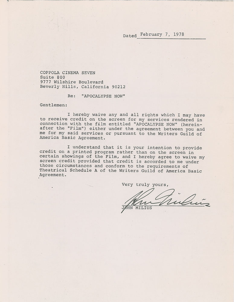 DS, signed “John Milius,” one page, 8.5 x 11, February 7, 1978. Agreement between Milius and Coppola Cinema Seven, in part: "I hereby waive any and all rights which I may have to receive credit on the screen for my services rendered in connection with the film entitled 'Apocalypse Now'?I understand that it is your intention to provide credit on a printed program rather than on the screen in certain showings of the Film, and I hereby agree to waive my screen credit provided that credit is accorded to me under those circumstances." In fine condition, with scattered light creasing. Milius wrote the screenplay for Apocalypse Now, adapting Joseph Conrad's classic novel Heart of Darkness to a setting amidst the Vietnam War.