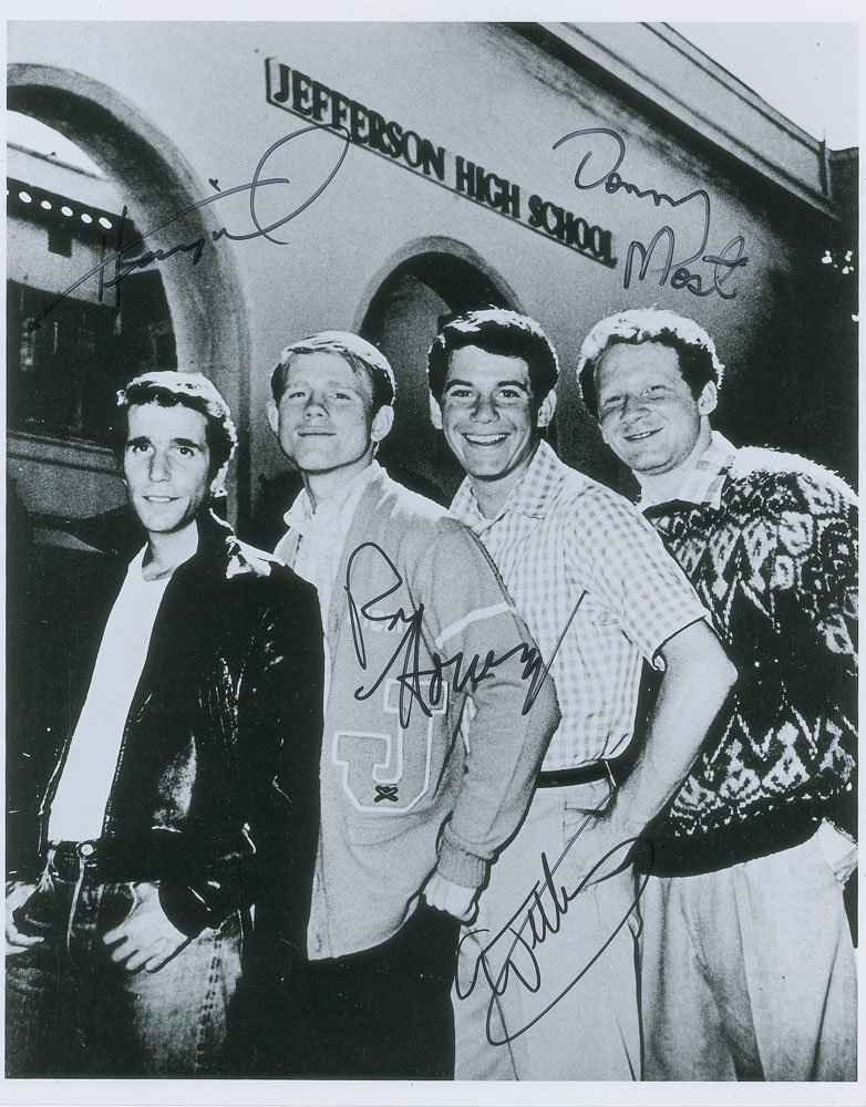 Glossy 11 x 14 photo of Happy Days buddies Fonzie, Richie Cunningham, Potsie, and Ralph Malph standing in front of Jefferson High School, signed in black felt tip by Henry Winkler, Ron Howard, Anson Williams, and Donny Most. In fine condition, with a trivial surface scratch passing through Howard's face. Accompanied by a full letter of authenticity from PSA/DNA.