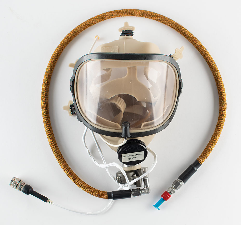 Space Shuttle-era emergency oxygen mask made by the Sierra Engineering Co., designed to connect to a temporary oxygen supply in the event of smoke or noxious gas inside the spacecraft, with a label applied to the filter on the front: "P/N SDD11100275-301, S/N 1049." The oxygen valve, tubing, and connectors all remain intact. In fine condition.