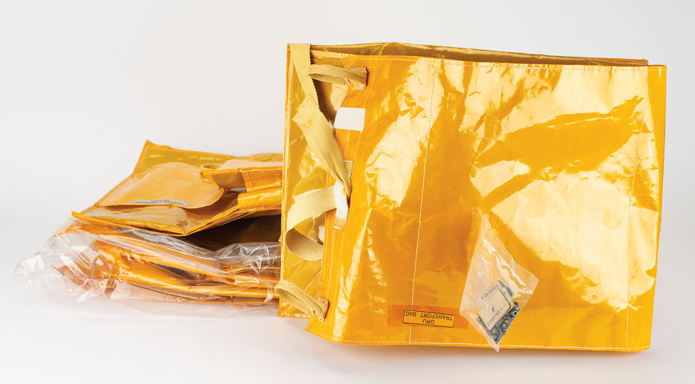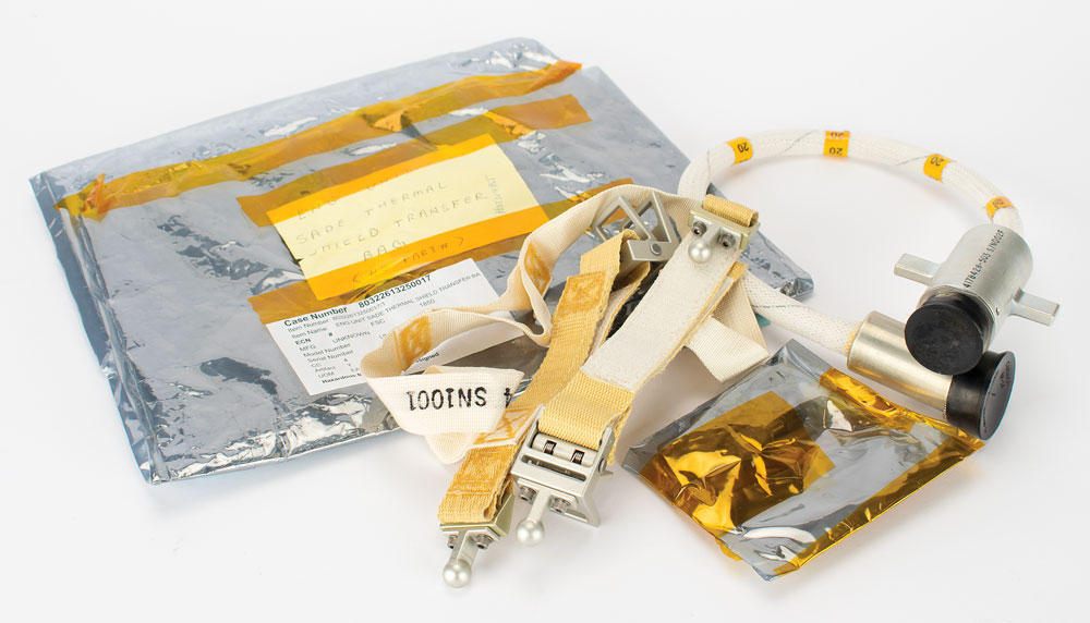 Collection of hardware associated with the Hubble Space Telescope, including: three DMU Capture Harnesses; a DIU Flight Model Harness; four bright orange MLI bags of different sizes; and a restraint strap. In overall very good to fine condition.