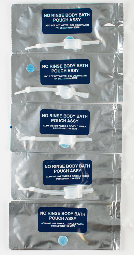 Group of five Space Shuttle-era "No Rinse Body Bath Pouch" assemblies, 9.5″ x 4″, with sealed nozzles to top, small Velcro swatches to either side, and identical instruction and parts labels: "Add 6 OZ Hot Water, 2 OZ Cold Water, P/N SED32103194-303." Two assemblies include the pouch tubing attached by Velcro, and two additional tubes are included. In overall fine condition.