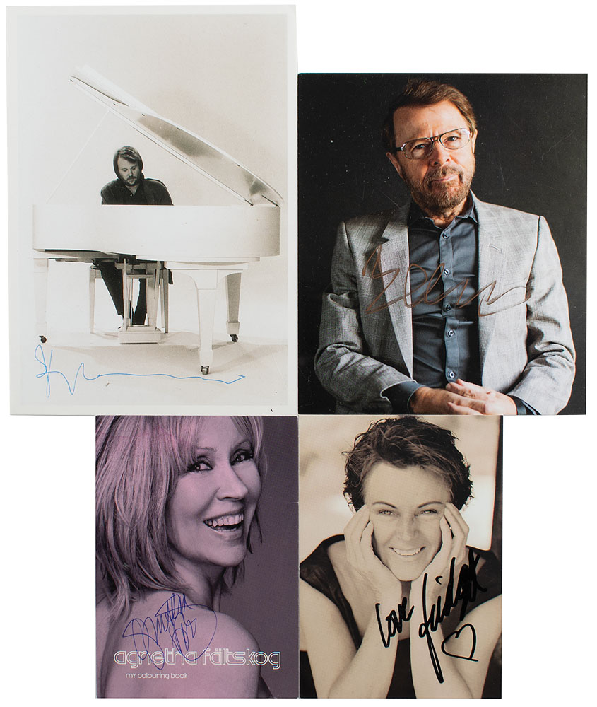 Group of four cardstock photos of the members of ABBA, ranging in size from 4 x 5.75 to 5.75 x 8.25, individually signed in ink or felt tip by Benny Andersson, Agnetha Fältskog, Anni-Frid Lyngstad, and Björn Ulvaeus. In overall fine condition.