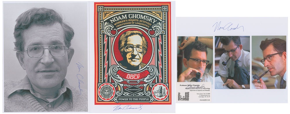 Four items: an MIT business card belong to Chomsky, 3.5 x 2, signed in black ballpoint; and three laserprint photos of the noted analytical philosopher, 8.5 x 11 and 11 x 8.5, each signed in blue ballpoint. In overall very fine condition.