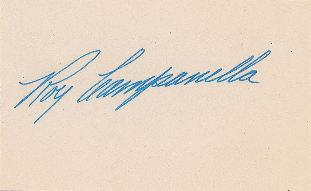 Desirable blue ink signature, "Roy Campanella,” on an off-white 4 x 2.5 card. In very fine condition, with old adhesive residue on the back.