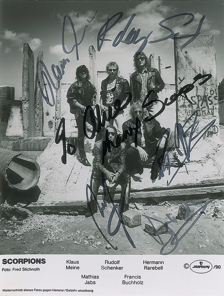 Glossy 6.5 x 8.5 Mercury Records promotional photo of the Scorpions, signed in black felt tip by Rudolf Schenker, Klaus Meine, Matthias Jabs, Herman Rarebell, and Francis Buchholz, with one adding the inscription "To Alice." Consignor notes that the autographs were obtained by a roadie. In fine condition. Accompanied by a certificate of authenticity from Tracks.