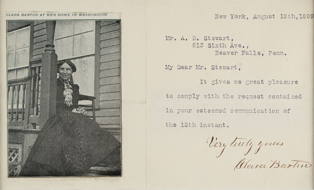 TLS signed “Very truly yours, Clara Barton,” one page, 4.25 x 5, August 19, 1899. Written from New York, a letter to A. B. Stewart, in full: "It gives me great pleasure to comply with your request contained in your esteemed communication of the 12th instant." The integral second page is unfolded and bears an affixed book photo of Barton at her home in Washington. Double-matted and framed to an overall size of 16 x 16. In fine condition.