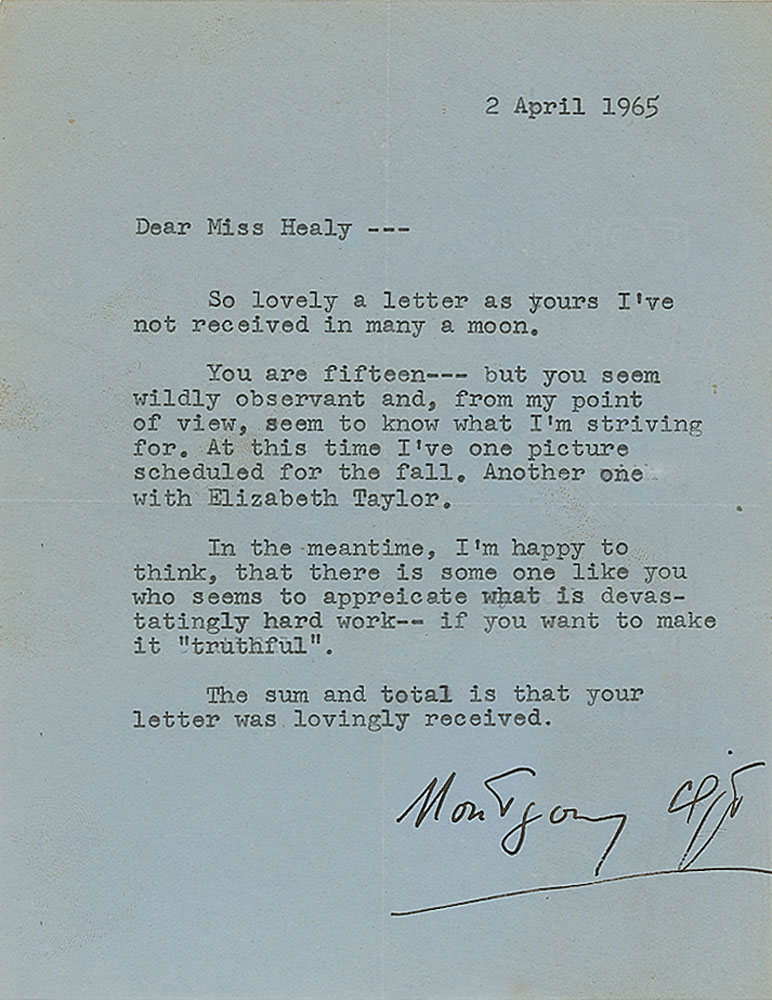 TLS, one page, 5.25 x 6.75, April 2, 1965. Letter to 15-year-old admirer Mary Healy, in full: "So lovely a letter as yours I've not received in many a moon. You are fifteen—but you seem wildly observant and, from my point of view, seem to know what I'm striving for. At this time I've one picture scheduled for the fall. Another one with Elizabeth Taylor. In the meantime, I'm happy to think, that there is some one like you who seems to appreciate what is devastatingly hard work—if you want to make it 'truthful.' The sum and total is that your letter was lovingly received." In fine condition. Accompanied by the original mailing envelope. The film with Elizabeth Taylor referenced here—Reflections in a Golden Eye, based on the novel by Carson McCullers—was delayed because of Clift's death in July 1966, prior to production. His starring role ultimately went to Marlon Brando.
