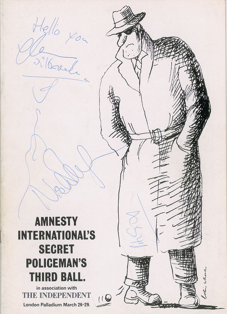 Official program for The Secret Policeman's Third Ball held at the London Palladium between March 26-29, 1987, eight pages, 8.25 x 11.75, signed on the front cover in blue ballpoint by David Gilmour, Nick Mason, Peter Gabriel, and Glenn Tilbrook, who adds "Hello you." In fine condition.