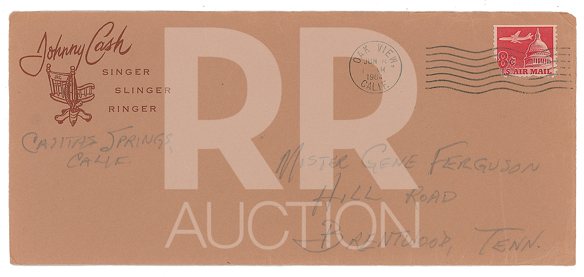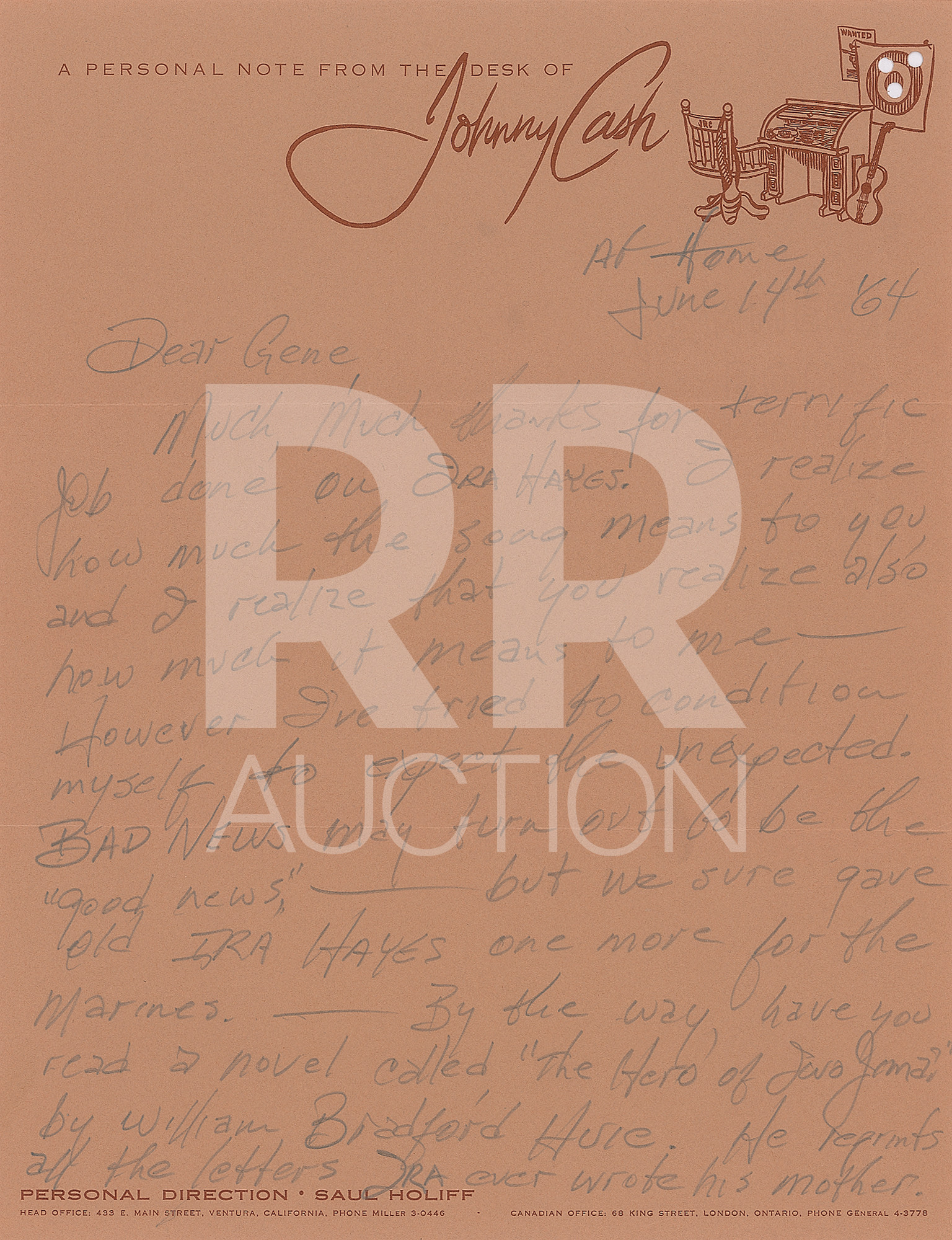 June 14, 1964, written in pencil “At home” from Casitas Springs, California, on “A Personal Note from the Desk of Johnny Cash” letterhead, in part: “Much, much thanks for terrific job done on Ira Hayes! I realize how much the song means to you, and I realize that you realize also how much it means to me—However I’ve tried to condition myself to expect the unexpected. Bad news may turn out to be the ‘good news,’—but we sure gave old Ira Hayes one more for the Marines.—By the way, have you read a novel called, ‘The Hero of Iwo Jima’ by William Bradford Huie. He reprints all the letters Ira ever wrote his mother. Thanks for writing La Farge. I still haven’t heard a word from him—and I sent him six copies of the record—sent a telegram, etc. Hope the disappointment in N.Y.C. didn’t put him back on booze. He’s an alcoholic, you know. He pulled a wild 7 day drunk six weeks ago. He said his next binge would put him back in the asylum. The thing that worries me is;—he said it as if he expected it to happen…Praises for the gold guitars. Andy Williams can’t even get one. Even if he knew ‘G’ chord.” Cash writes a postscript on the reverse of second page: “Come see me sometime. We will capture a wild horse. I know where there’s a whole bunch of ‘em—3 hours from here. It only gets about 130° on Wild Horse Mesa this time of the year. Day time, that is—nights cool.” Includes the original hand-addressed “Johnny Cash, Singer, Slinger, Ringer” mailing envelope.