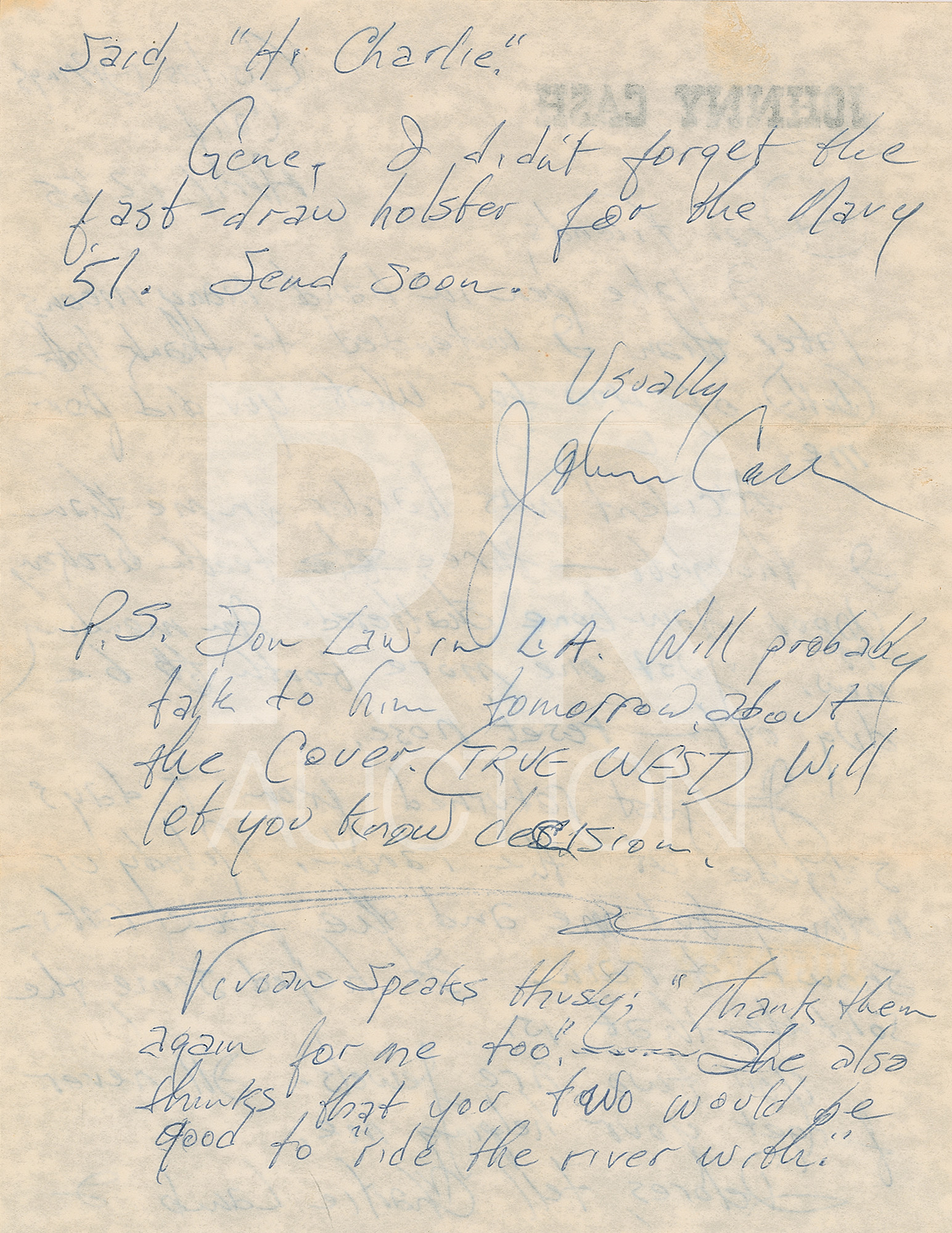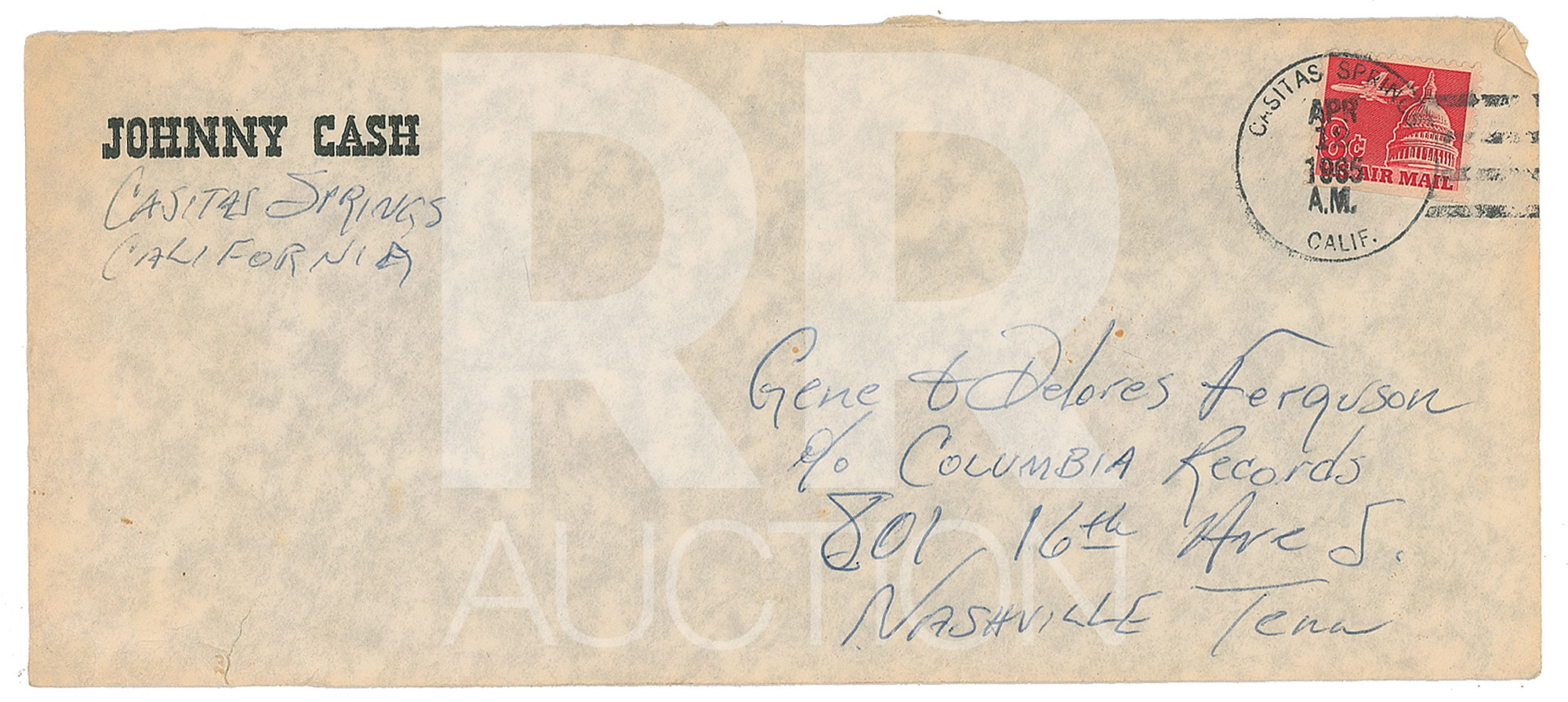 April 12, 1965, written from Casitas Springs on his personal letterhead, in part: “ I take pen in hand many moons later than I intended to thank (both) of you for what you did for me. Accident was harder on me than I thought—three teeth broken, upper jaw-bone shattered. Am mending now. Just one more toother to be dug out—reset nose. I just returned from 4 days solitude at the ranch. Nobody or nothing but me and the pack rats—snow & rain. It helped some, the solitude, that is. You two are jewels. I’ll never forget your helping me.” Cash adds a postscript: “Don Law in L.A. Will probably talk to him tomorrow about the cover. (True West) Will let you know decision.” Includes the original hand-addressed “Johnny Cash” mailing envelope.